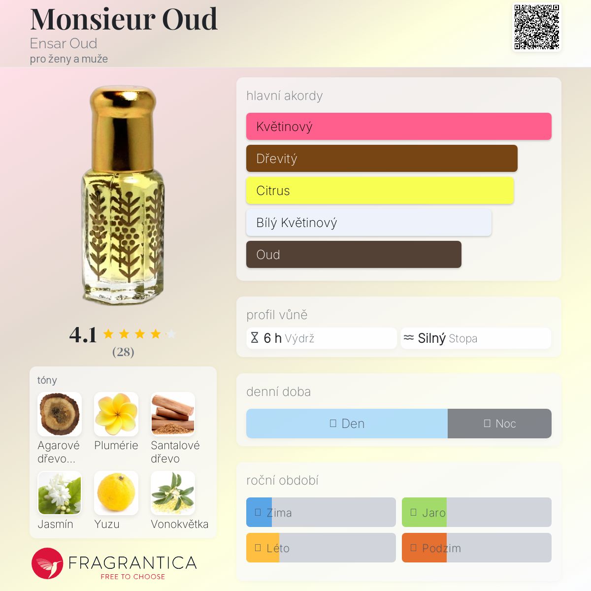 Monsieur Oud podle Ensar Oud je vůně pro ženy a muže. Vrchní tóny jsou Yuzu, Cibetka, Bergamot, Petitgrain, Brazilské růžové dřevo, Růžový pepř, Guajakové dřevo a Jedle balzámová; střední tóny jsouPlumérie, Jasmín, Vonokvětka, Pomerančový květ, Boronia, Mimóza, Kávový květ a Kosatec ; základní tóny jsou Agarové dřevo (oud), Santalové dřevo a Aloe Vera.