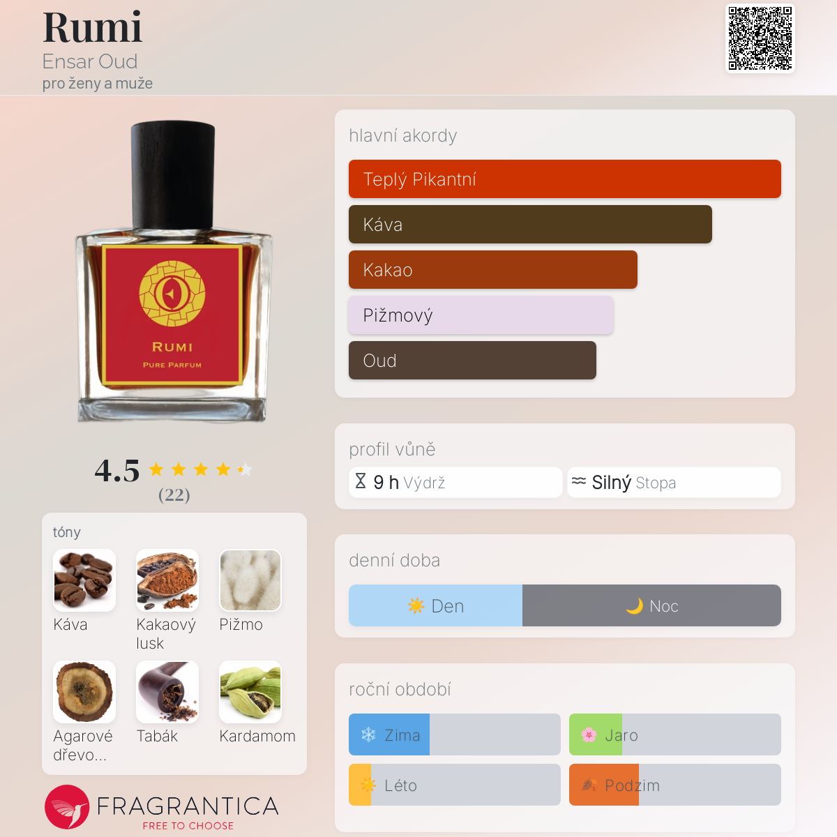 Rumi podle Ensar Oud je vůně pro ženy a muže. Vrchní tóny jsou Kardamom, Zázvor, Meruňka a Hřebíček; střední tóny jsouVonokvětka, Turecká růže, Růže, Bourbonské geránium , Narcis, Jasmín Sambac, Černý bez a Ylang-Ylang ; základní tóny jsou Káva, Kakaový lusk, Pižmo, Agarové dřevo (oud), Tabák, Ambra a Olibanum.