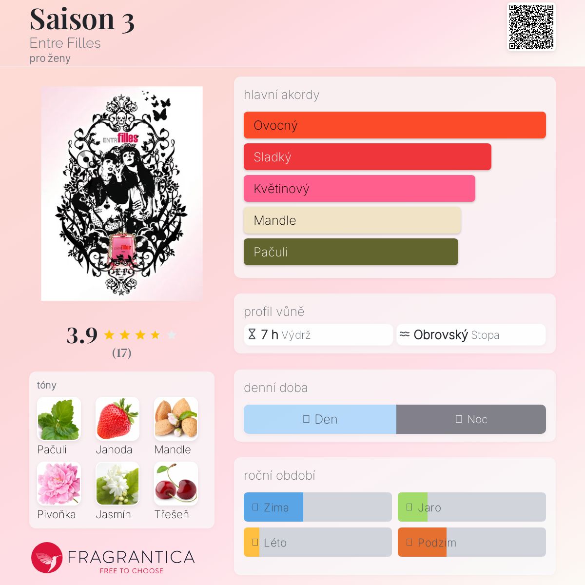 Saison 3 podle Entre Filles je Floral Fruity vůně pro ženy. Saison 3 byl/a uveden/a v roce 2008. Vrchní tóny jsou Velká jahoda, Mandle, Třešeň a Černý rybíz; střední tóny jsouPivoňka a Jasmín ; základní tóny jsou Pačuli a Pižmo.
