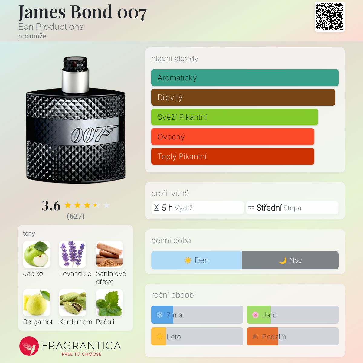 James Bond 007 podle Eon Productions je Aromatic Fougere vůně pro muže. James Bond 007 byl/a uveden/a v roce 2012. "Nosem" za touto vůní je Sonia Constant. Vrchní tóny jsou Jablko, Bergamot a Pelargónie; střední tóny jsouLevandule, Kardamom a Růže ; základní tóny jsou Santalové dřevo, Pačuli, Mech a Vetiver.