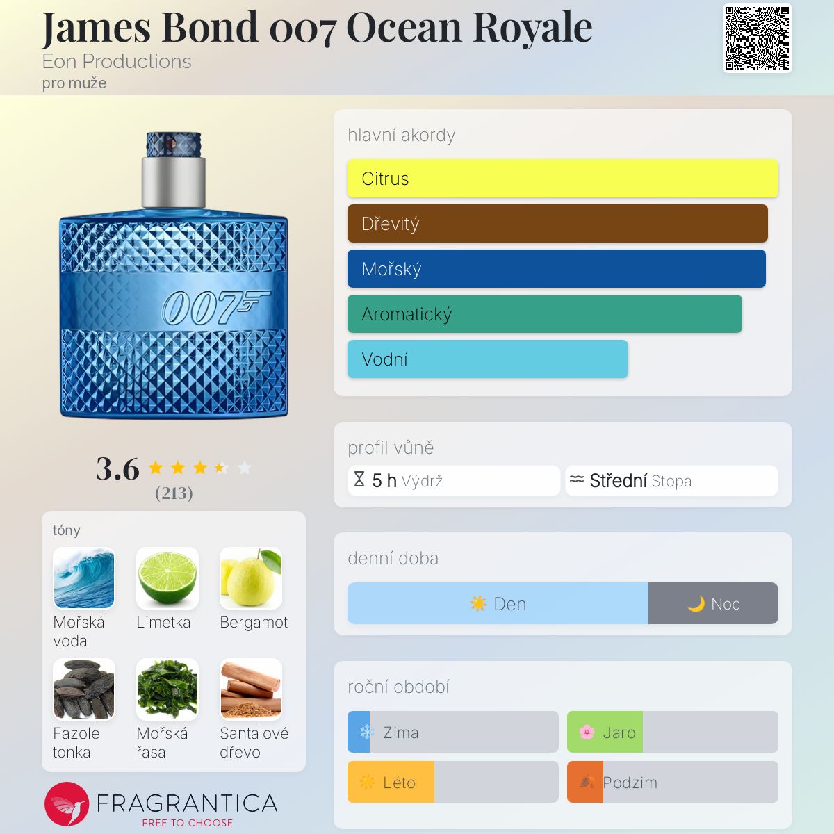 James Bond 007 Ocean Royale podle Eon Productions je Woody Aquatic vůně pro muže. James Bond 007 Ocean Royale byl/a uveden/a v roce 2013. Vrchní tóny jsou Mořské tóny, Limetka, Bergamot, Mořská řasa a Anýz; střední tóny jsouKosatec, Týkové dřevo a Cedr ; základní tóny jsou Fazole tonka, Santalové dřevo, Káva a Guajakové dřevo.