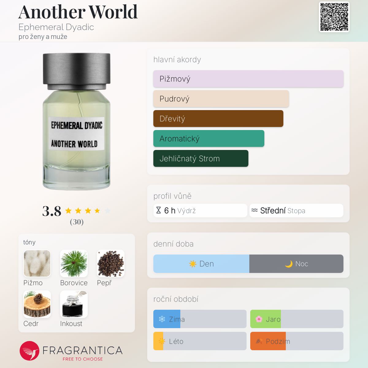 Another World podle Ephemeral Dyadic je vůně pro ženy a muže. Another World byl/a uveden/a v roce 2023. Vrchní tóny jsou Černý pepř a Inkoust; střední tón jeBorovice ; základní tóny jsou Bílé pižmo a Cedr.