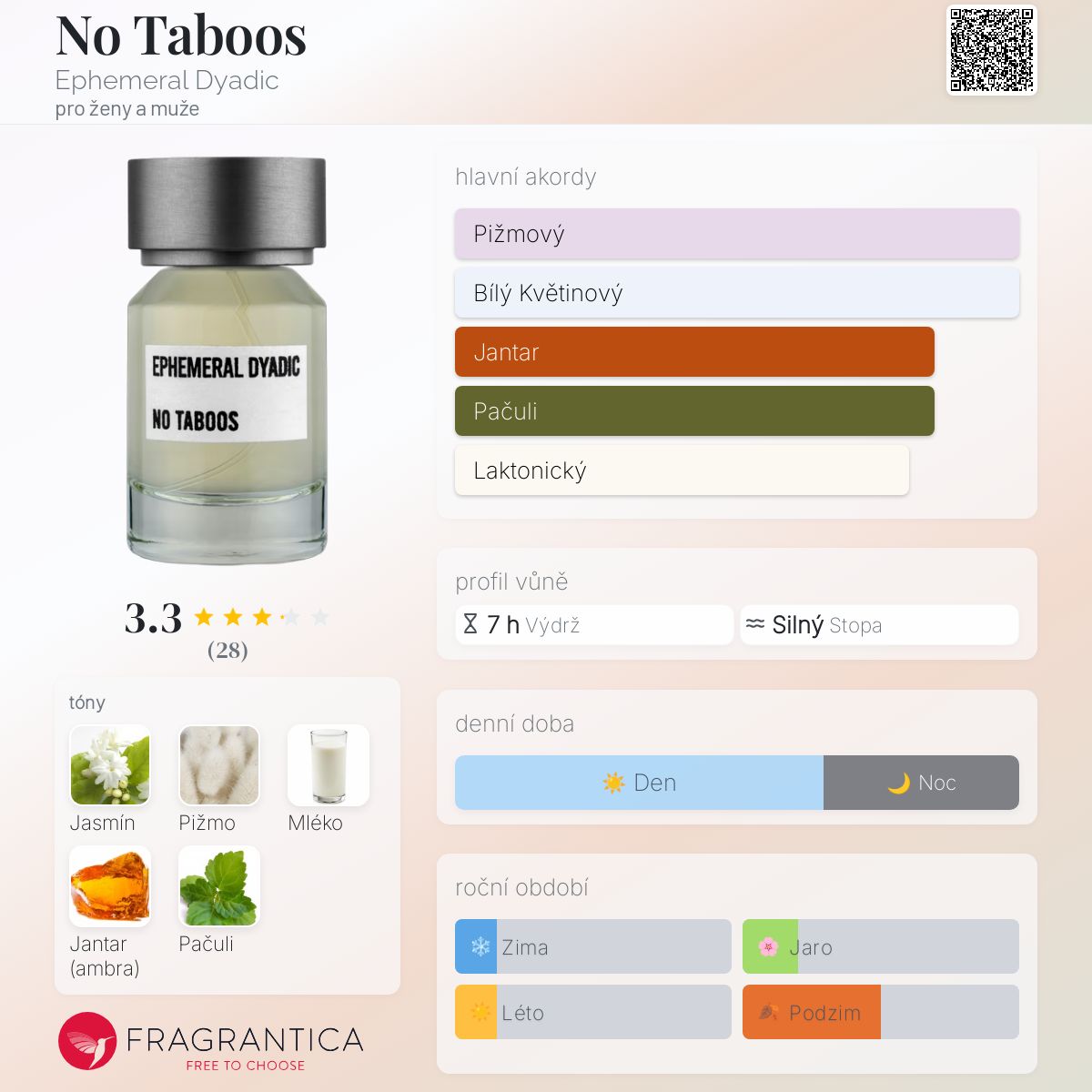 No Taboos podle Ephemeral Dyadic je vůně pro ženy a muže. No Taboos byl/a uveden/a v roce 2023. Vrchní tón je Mléko ; střední tóny jsouJasmín a Červený jantar (ambra) ; základní tóny jsou Pižmo, Jantar (ambra) a Pačuli.