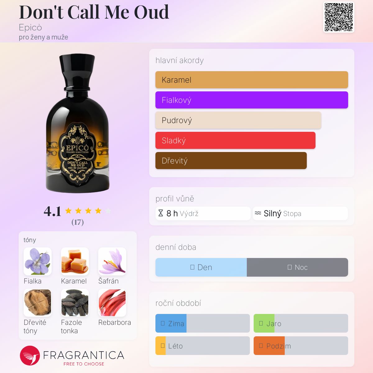 Don't Call Me Oud podle Epicò je Orientální vůně pro ženy a muže. Toto je nová vůně. Don't Call Me Oud byl/a uveden/a v roce 2024. "Nosem" za touto vůní je Federico Gucciardi. Vrchní tóny jsou Šafrán, Rebarbora, Jablko a Bergamot; střední tóny jsouFialka, Šafrán, Agarové dřevo (oud), Růže a Jasmín ; základní tóny jsou Karamel, Dřevité tóny, Fazole tonka, Vanilka a Agarové dřevo (oud).