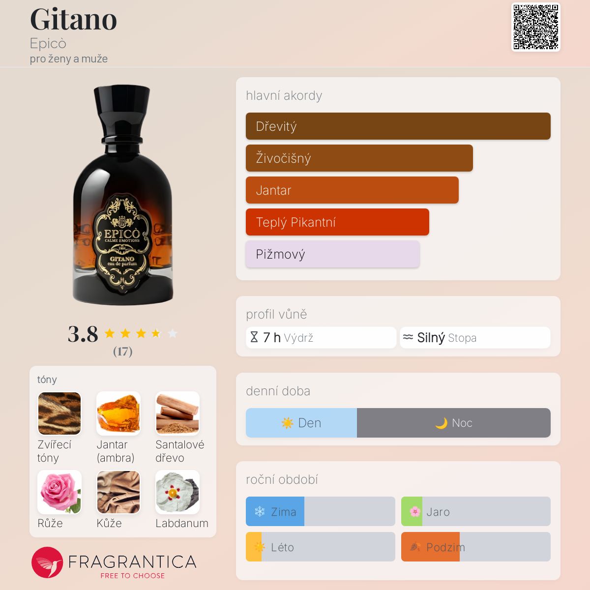 Gitano podle Epicò je vůně pro ženy a muže. Gitano byl/a uveden/a v roce 2022. Vrchní tóny jsou Bulharská růže, Labdanum a Kardamom; střední tóny jsouPačuli, Agarové dřevo (oud), Jasmín, Cypriolový olej a Cedr ; základní tóny jsou Zvířecí tóny, Jantar (ambra), Santalové dřevo, Kůže a Guajakové dřevo.