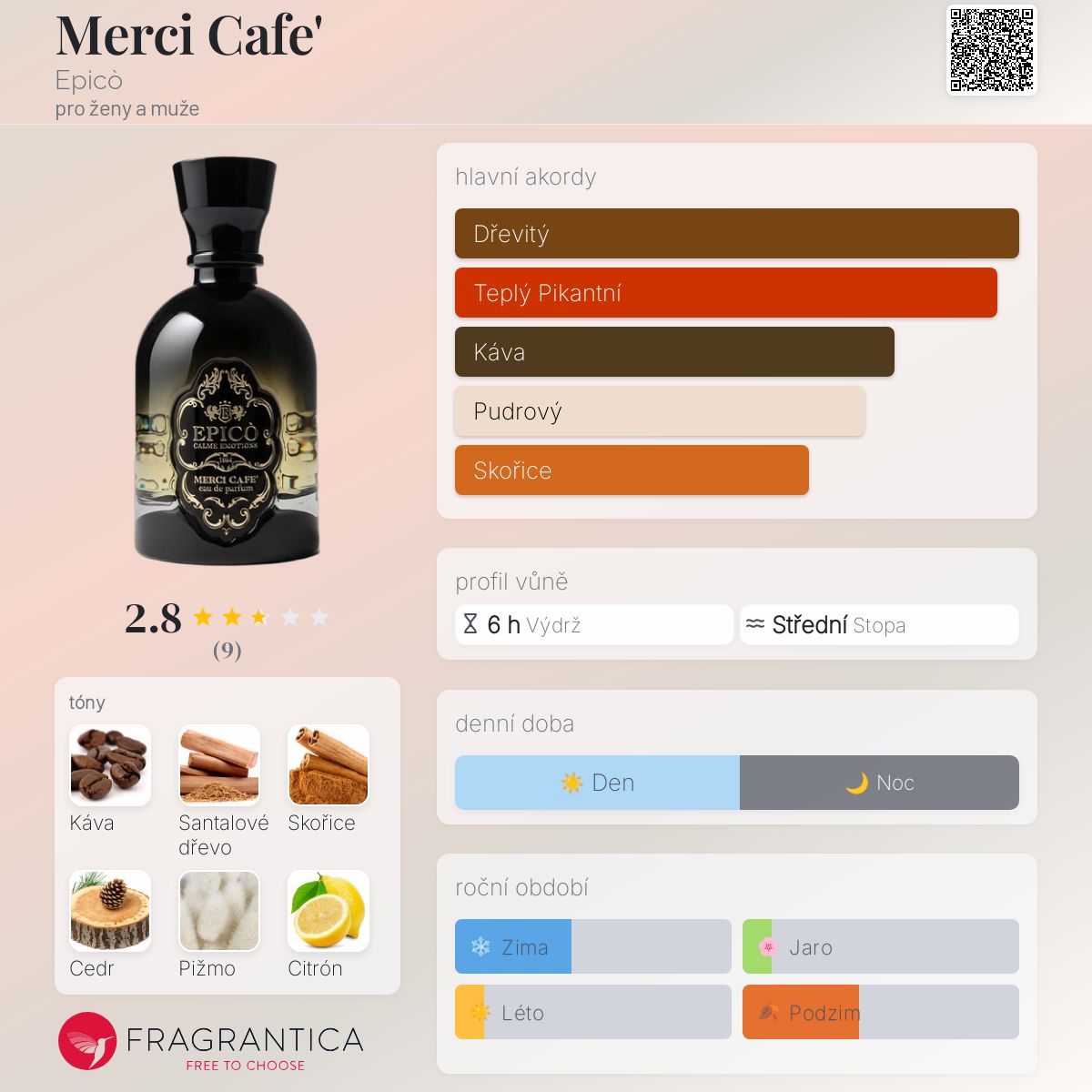 Merci Cafe' podle Epicò je Orientální Vanilla vůně pro ženy a muže. Toto je nová vůně. Merci Cafe' byl/a uveden/a v roce 2024. Vrchní tóny jsou Skořice, Citrón a Bergamot; střední tóny jsouKáva, Kokosové mléko, Madeleine a Mléko ; základní tóny jsou Santalové dřevo, Cedr, Pižmo a Vanilka.