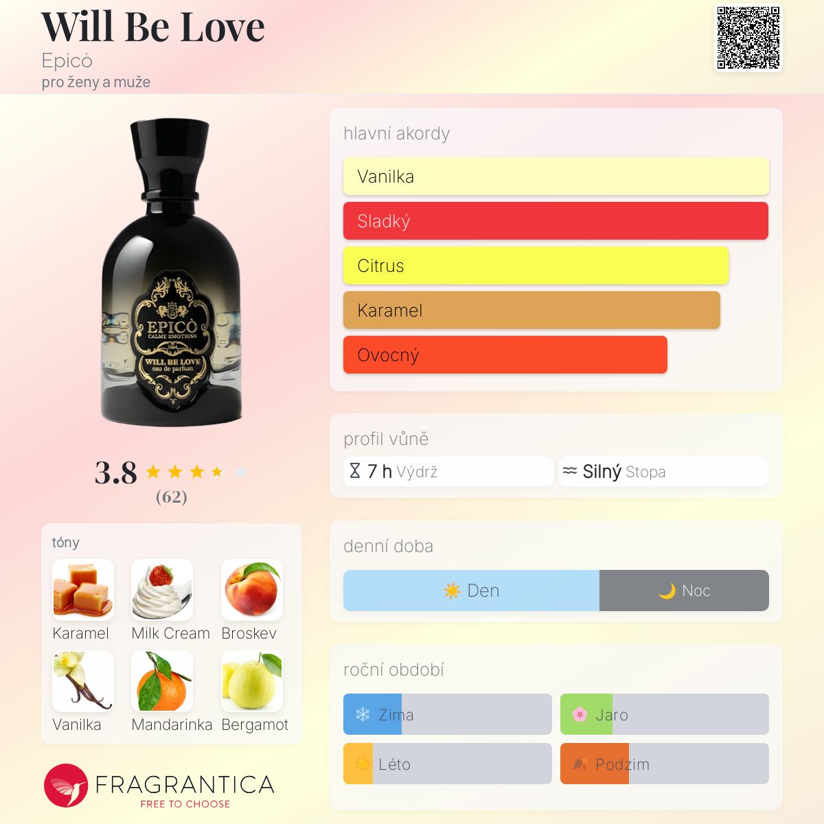 Will Be Love podle Epicò je vůně pro ženy a muže. Will Be Love byl/a uveden/a v roce 2023. Vrchní tóny jsou Mléčný krém, Mandarinka a Bergamot; střední tóny jsouKaramel, Broskev, Vanilka, Kokos a Elimi ; základní tóny jsou Vanilka, Pačuli, Pižmo, Fazole tonka a Ambra.