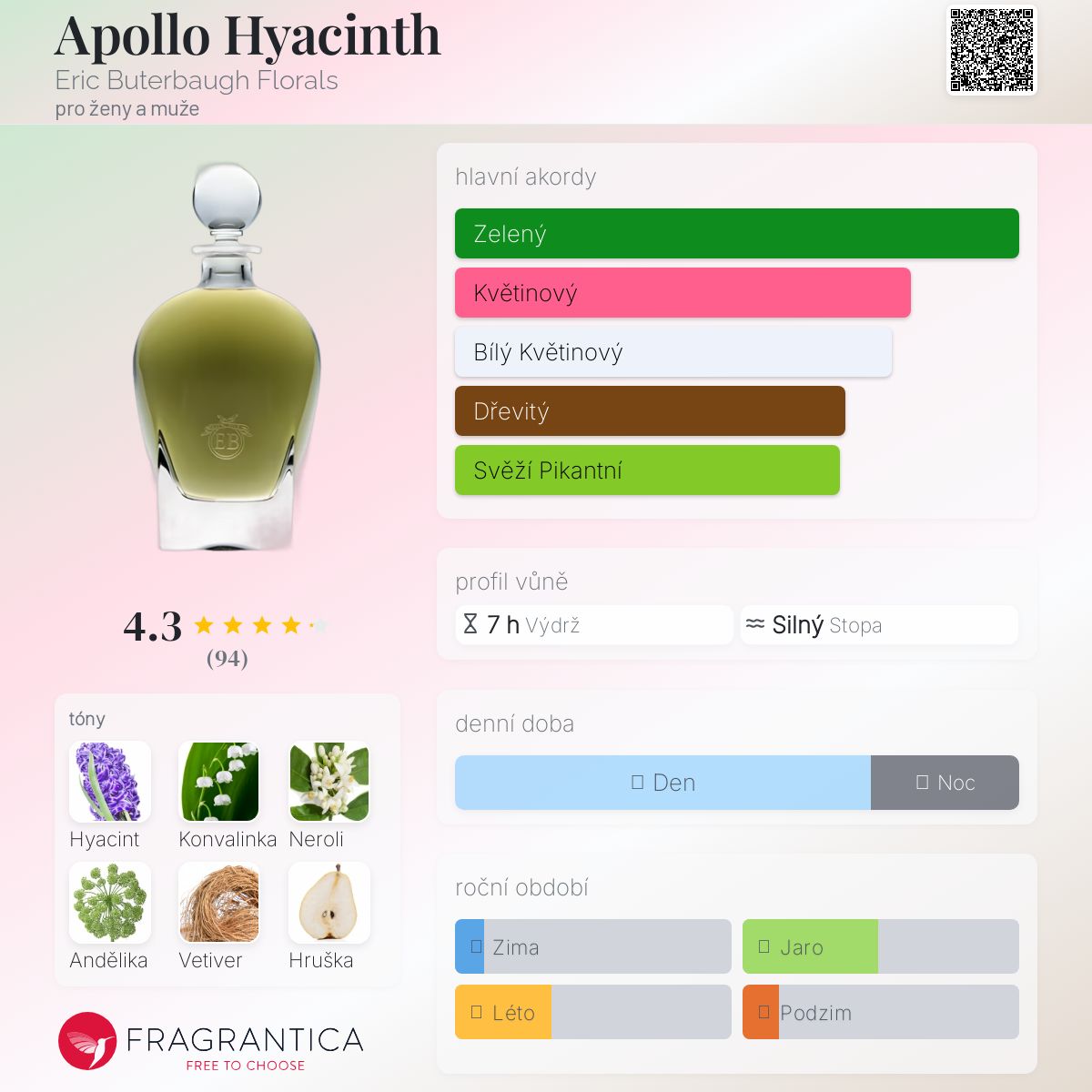 Apollo Hyacinth podle Eric Buterbaugh Florals je Floral Green vůně pro ženy a muže. Apollo Hyacinth byl/a uveden/a v roce 2015. "Nosem" za touto vůní je Alberto Morillas. Vrchní tóny jsou Neroli, Hruška a Galbanum; střední tóny jsouHyacint, Konvalinka a Andělika ; základní tóny jsou Haitský vetiver, Cedr a Dubový mech.