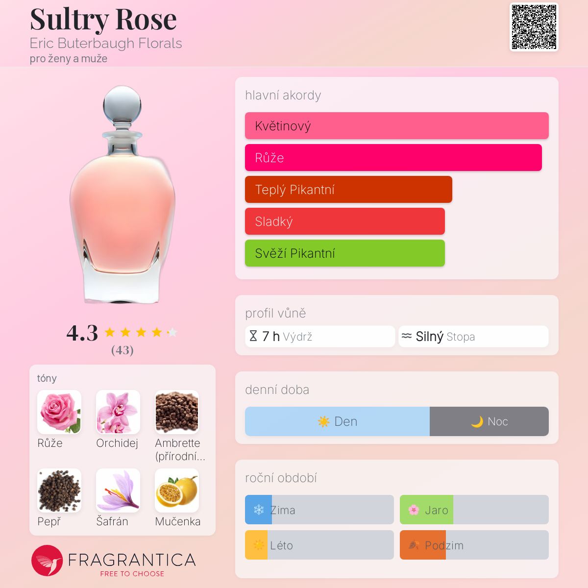 Sultry Rose podle Eric Buterbaugh Florals je Floral vůně pro ženy a muže. Sultry Rose byl/a uveden/a v roce 2015. "Nosem" za touto vůní je Ilias Ermenidis. Vrchní tóny jsou Turecká růže, Pepř a Mučenka; střední tóny jsouRůžová voda, Vanilková orchidej a Šafrán ; základní tóny jsou Ambrette (přírodní pižmo), Ambra a Agarové dřevo (oud).