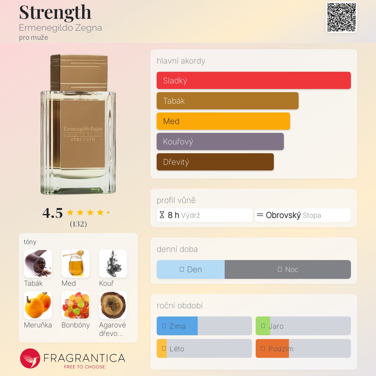 Strength podle Ermenegildo Zegna je Orientální Vanilla vůně pro muže. Strength byl/a uveden/a v roce 2017. Vrchní tóny jsou Tabákový list a Sladké tóny; střední tóny jsouMed, Meruňka a Agarové dřevo (oud) ; základní tóny jsou Kouř a Borovice.