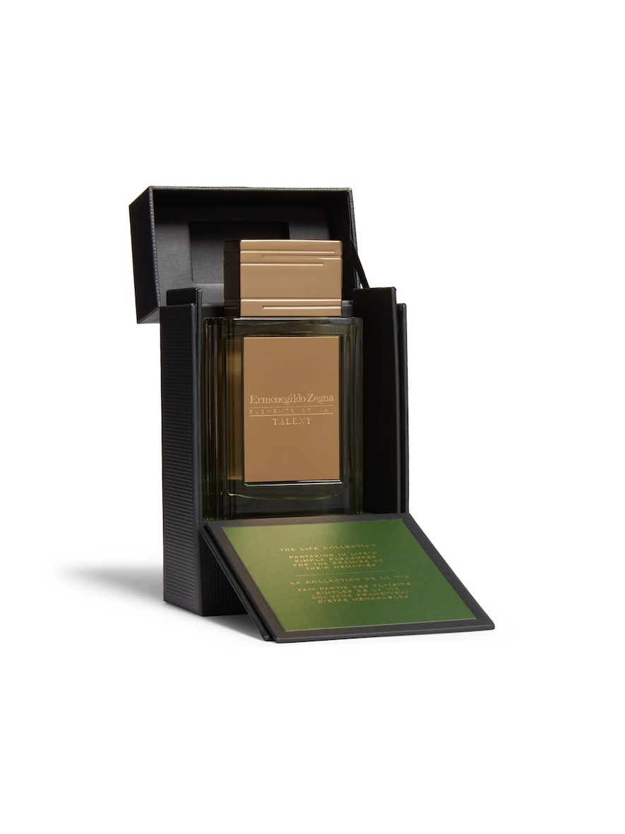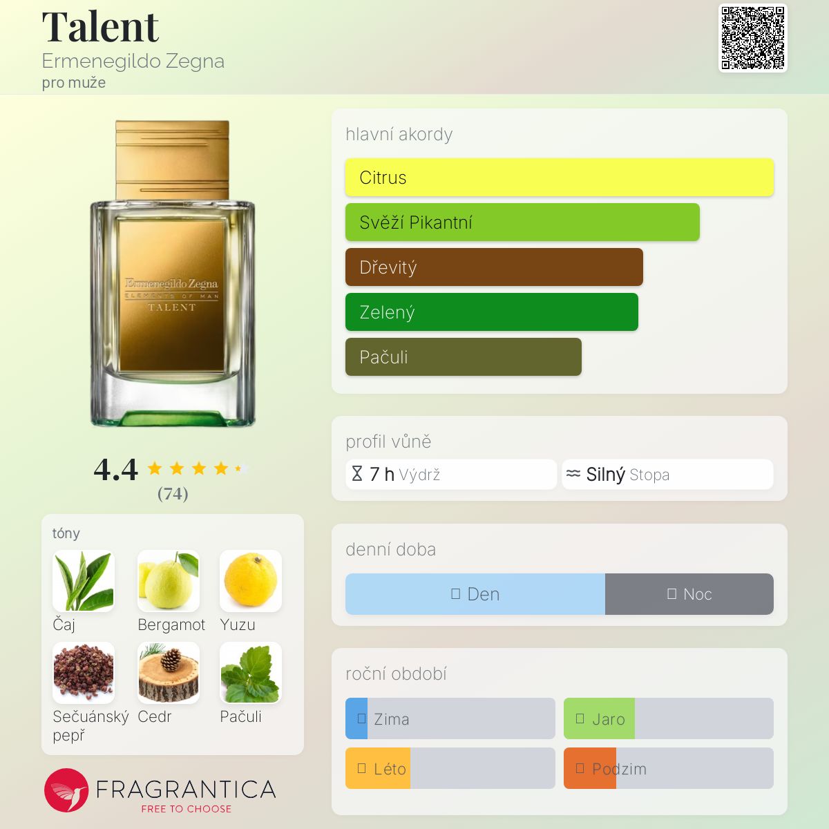 Talent podle Ermenegildo Zegna je Woody Spicy vůně pro muže. Talent byl/a uveden/a v roce 2017. Vrchní tóny jsou Bergamot, Yuzu a Sečuánský pepř; střední tón jeČerný čaj ; základní tóny jsou Cedr a Pačuli.