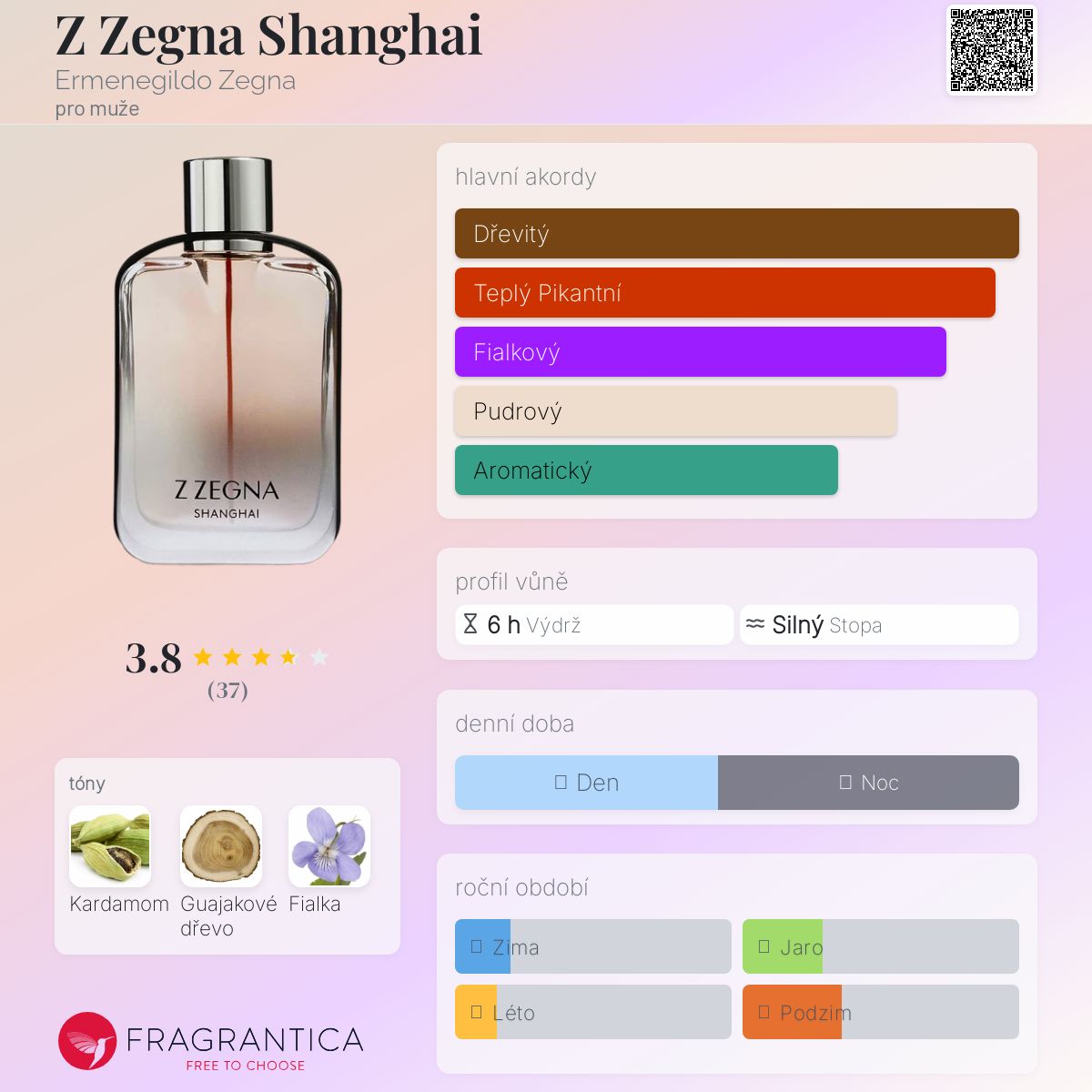 Z Zegna Shanghai podle Ermenegildo Zegna je Woody Aromatic vůně pro muže. Z Zegna Shanghai byl/a uveden/a v roce 2016. "Nosem" za touto vůní je Trudi Loren. Vrchní tón je Kardamom ; střední tón jeFialka ; základní tón je Guajakové dřevo.