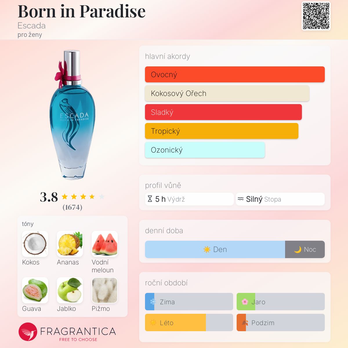 Born in Paradise podle Escada je Floral Fruity vůně pro ženy. Born in Paradise byl/a uveden/a v roce 2014. Vrchní tóny jsou Vodní meloun, Guava a Zelené jablko; střední tóny jsouKokosové mléko a Ananas ; základní tóny jsou Pižmo, Santalové dřevo a Cedr.