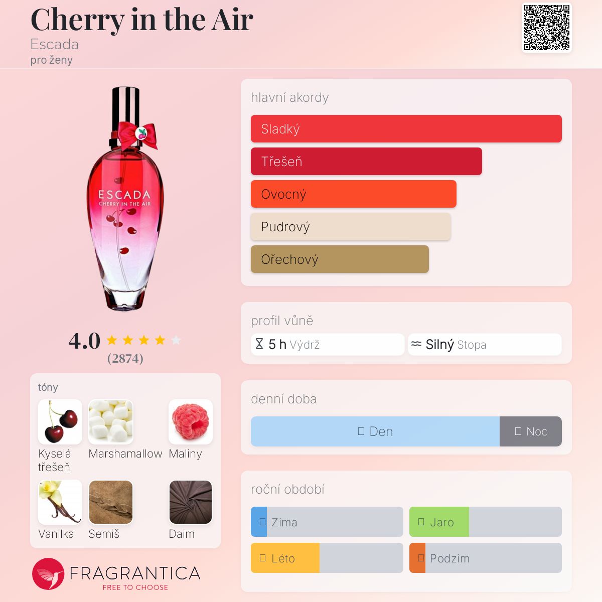 Cherry in the Air podle Escada je Floral Fruity vůně pro ženy. Cherry in the Air byl/a uveden/a v roce 2013. Vrchní tóny jsou Kyselá třešeň, Maliny, Daim a Mandarinka; střední tóny jsouMarshamallow, Vanilka, Gardénie a Orchidej ; základní tóny jsou Bílý semiš, Santalové dřevo, Pižmo a Dub.