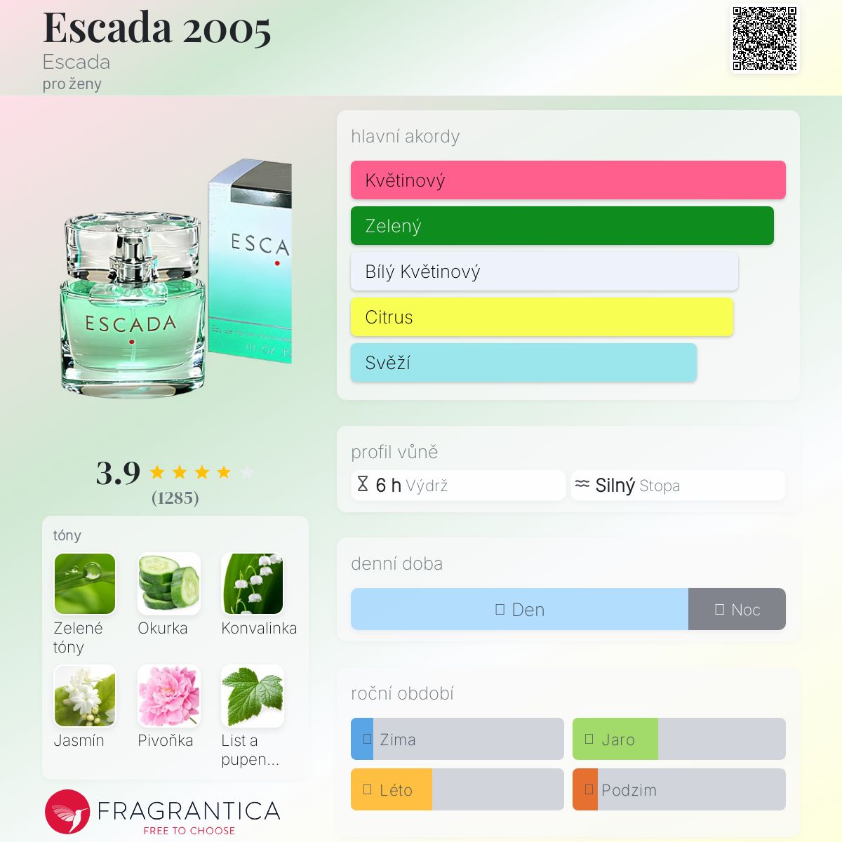Escada 2005 podle Escada je Chypre Floral vůně pro ženy. Escada 2005 byl/a uveden/a v roce 2005. "Nosem" za touto vůní je Pierre Bourdon. Vrchní tóny jsou Zelené listí, Okurka, Kasie, Bergamot, Černý rybíz, Citrón a Nektarinka; střední tóny jsouKonvalinka, Jasmín, Pivoňka, Frézie, Magnólie, Pomerančový květ a Růže ; základní tóny jsou Pižmo, Kosatec, Pačuli, Mandarinka, Santalové dřevo, Jantar (ambra) a Vanilka.
