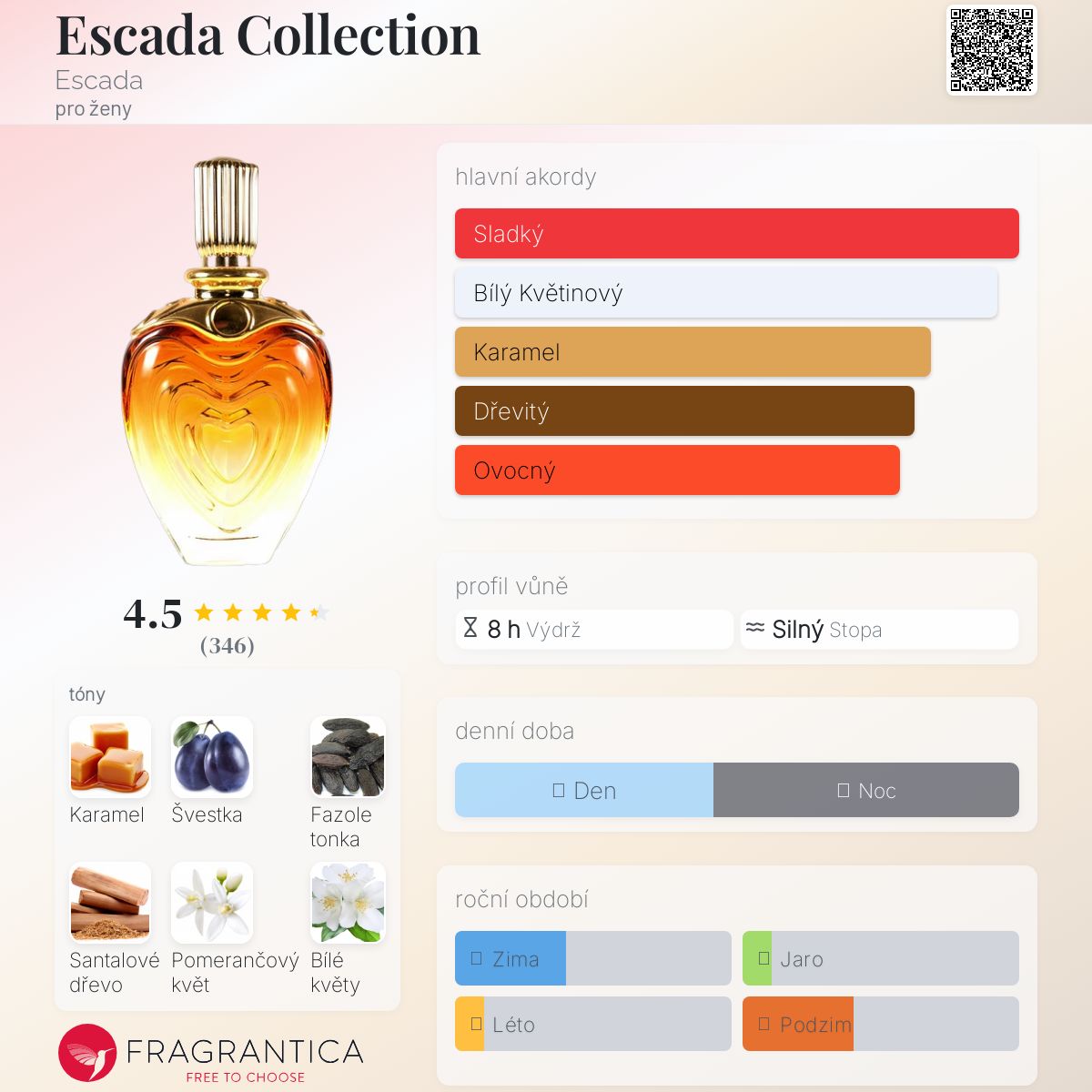 Escada Collection podle Escada je Orientální vůně pro ženy. Escada Collection byl/a uveden/a v roce 1997. "Nosem" za touto vůní je Francoise Caron. Vrchní tóny jsou Karamel a Švestka; střední tóny jsouPomerančový květ, Bílé květy, Jasmín a Růže ; základní tóny jsou Fazole tonka, Santalové dřevo, Pižmo a Cedr.