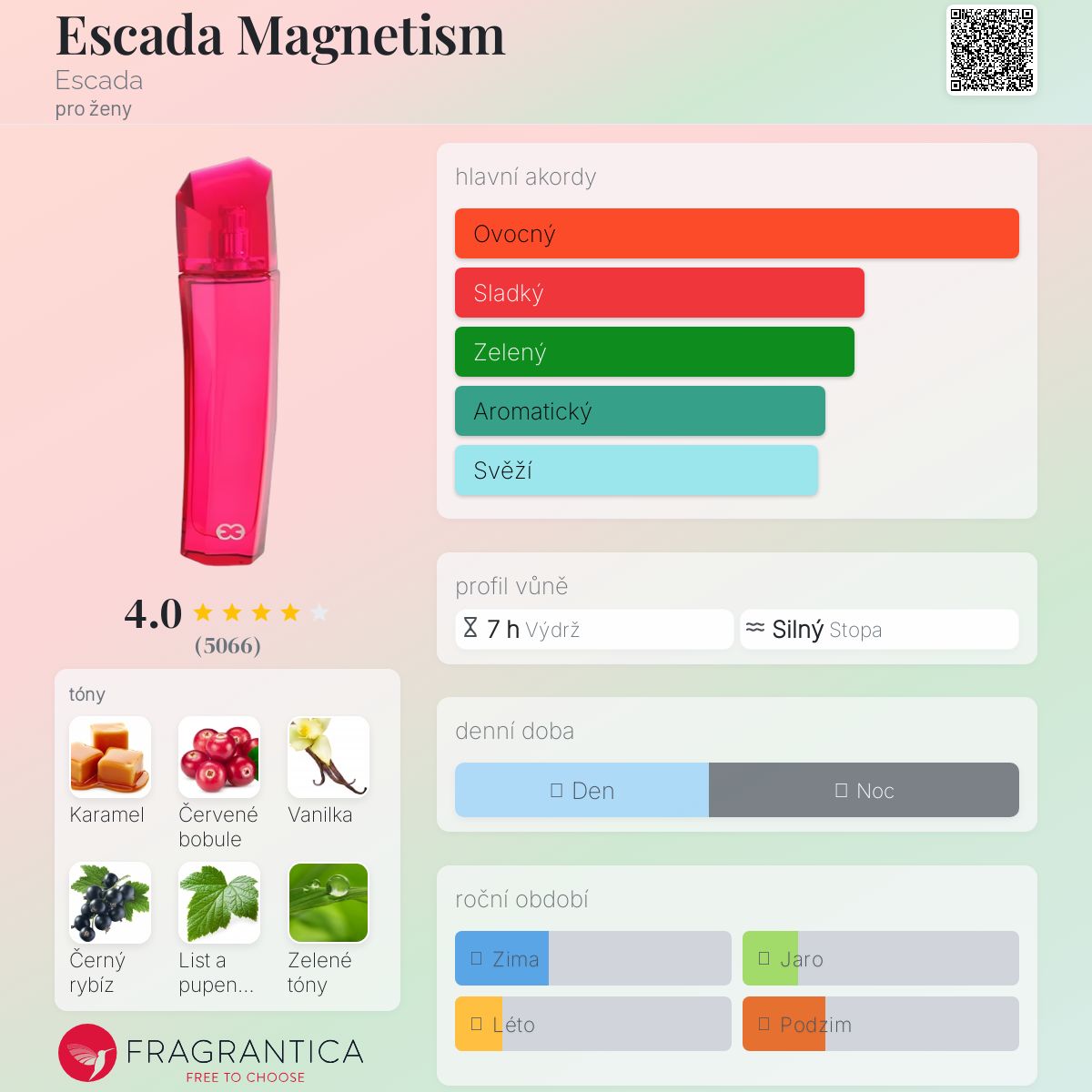 Escada Magnetism podle Escada je Orientální Vanilla vůně pro ženy. Escada Magnetism byl/a uveden/a v roce 2003. Escada Magnetism byl/a vytvořen/a Steve DeMercado a Pierre Bourdon. Vrchní tóny jsou Červené bobule, Černý rybíz, Kasie, Liči, Ananas a Meloun; střední tóny jsouZelené listí, Bazalka, Mandlový květ , Kosatec, Frézie, Otočník, Magnólie, Jasmín, Růže, Kmín a Konvalinka ; základní tóny jsou Karamel, Vanilka, Pačuli, Benzoin, Santalové dřevo, Pižmo, Jantar (ambra) a Vetiver.