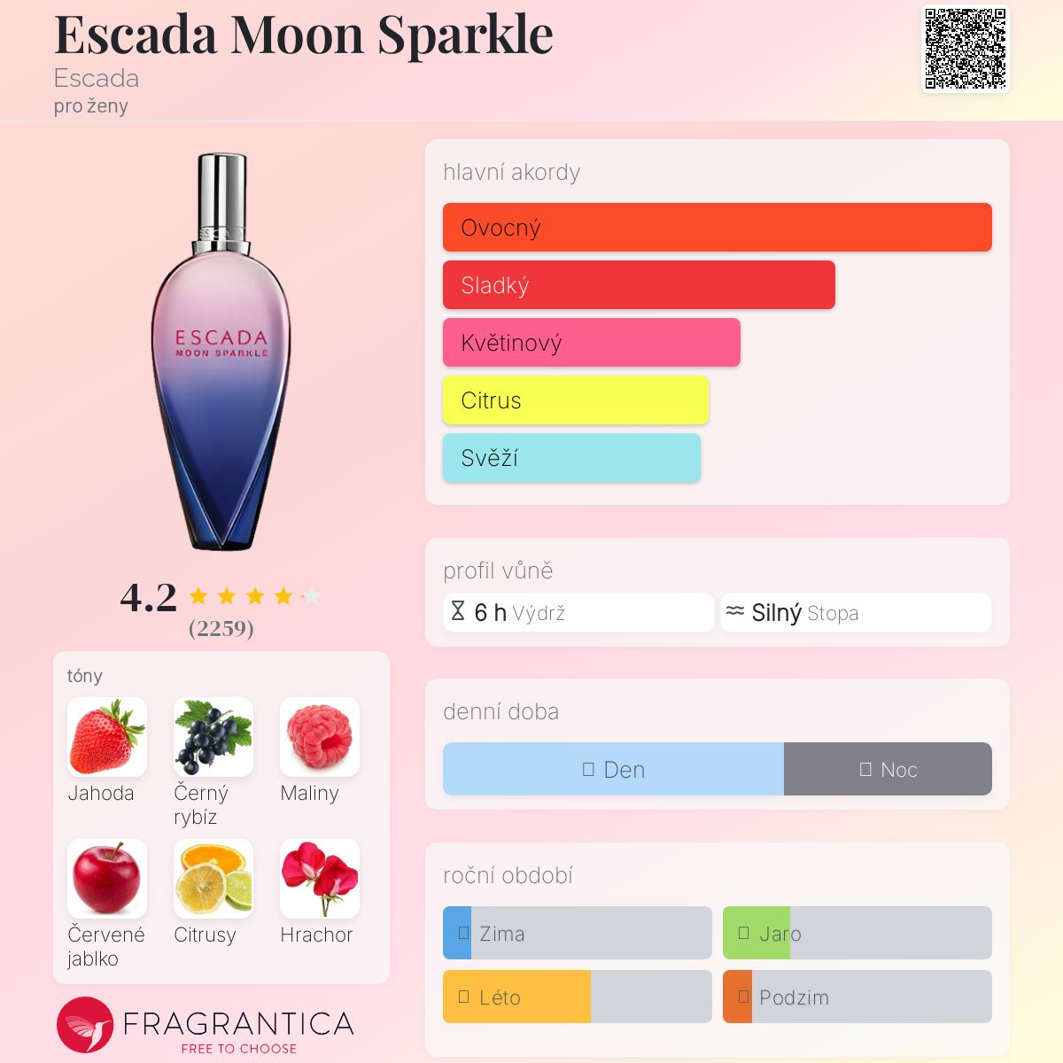 Escada Moon Sparkle podle Escada je Floral Fruity vůně pro ženy. Escada Moon Sparkle byl/a uveden/a v roce 2007. "Nosem" za touto vůní je Aurélien Guichard. Vrchní tóny jsou Jahoda, Černý rybíz, Červené jablko a Citrusy; střední tóny jsouHrachor, Frézie, Jasmín a Růže ; základní tóny jsou Maliny, Pižmo, Santalové dřevo a Jantar (ambra).