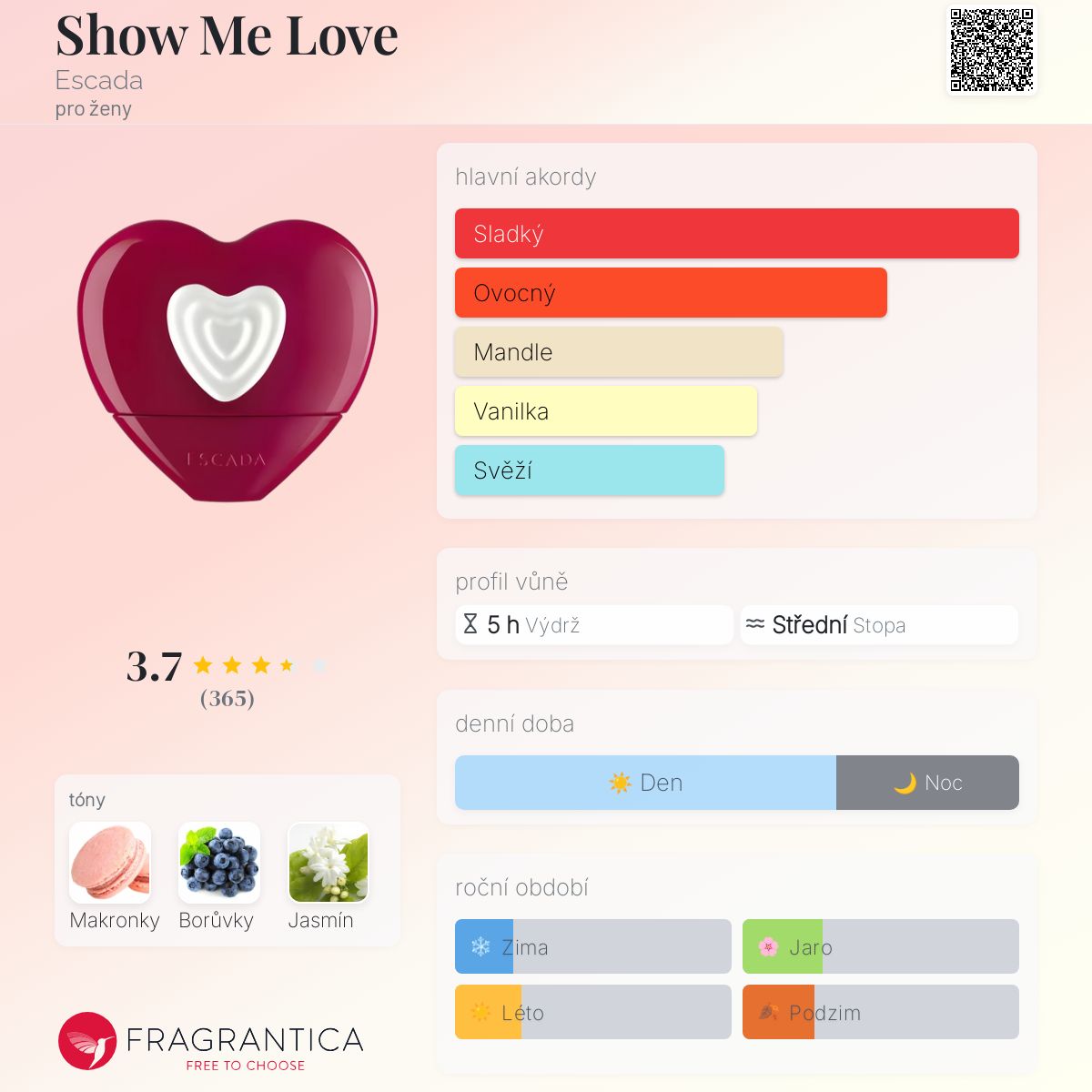 Show Me Love podle Escada je Floral Fruity Gourmand vůně pro ženy. Show Me Love byl/a uveden/a v roce 2022. "Nosem" za touto vůní je Alexandra Carlin. Vrchní tón je Borůvky ; střední tón jeJasmín ; základní tóny jsou Makronky a Borůvky.