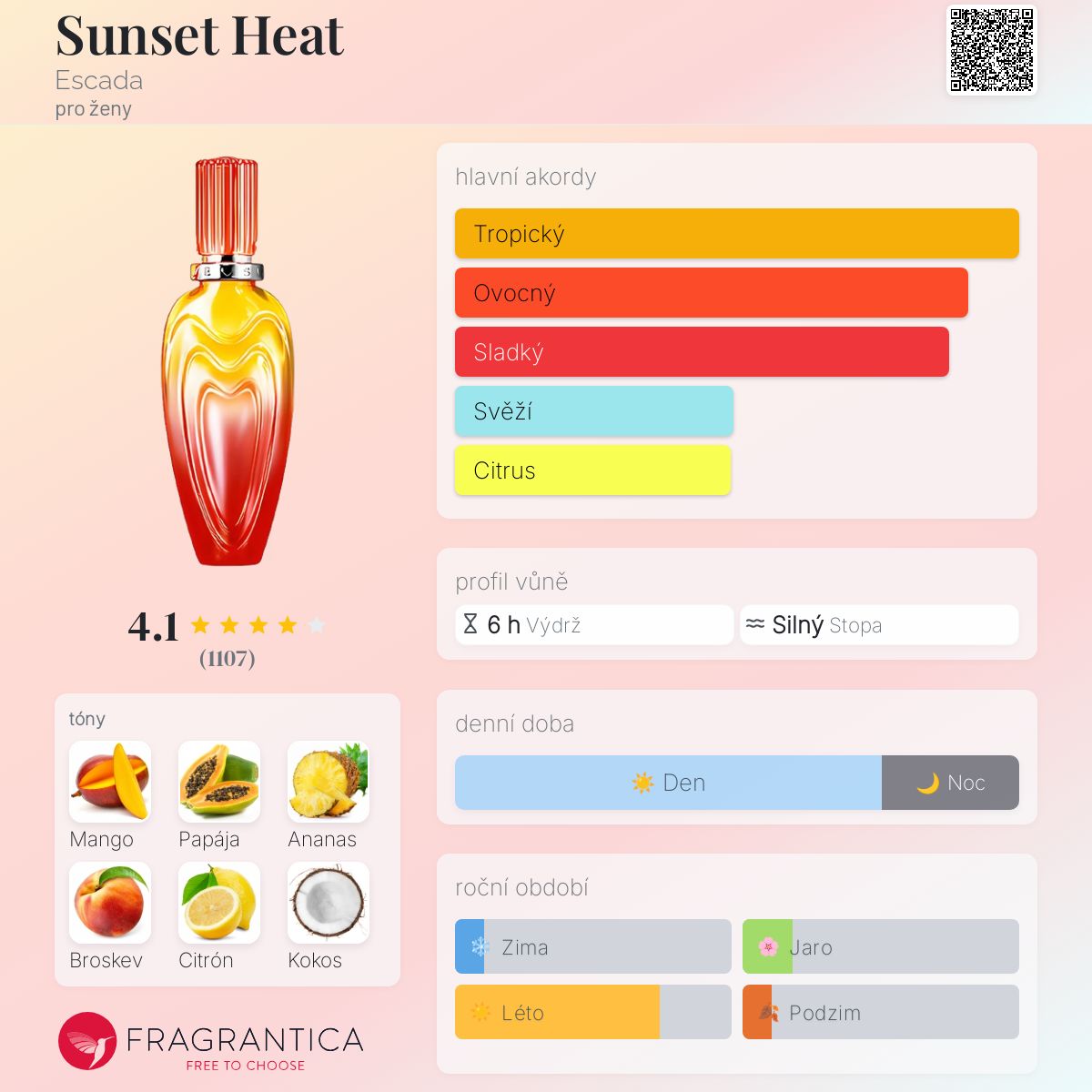 Sunset Heat podle Escada je Floral Fruity vůně pro ženy. Sunset Heat byl/a uveden/a v roce 2007. Vrchní tóny jsou Mango, Papája, Ananas a Citrón; střední tón jeBroskev ; základní tóny jsou Kokos, Ibišek a Santalové dřevo.
