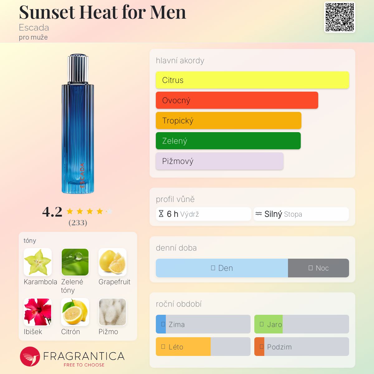 Sunset Heat for Men podle Escada je Woody Aquatic vůně pro muže. Sunset Heat for Men byl/a uveden/a v roce 2007. "Nosem" za touto vůní je Jean-Louis Grauby. Vrchní tóny jsou Karambola, Grapefruit a Citrón; střední tóny jsouZelené listí, Ibišek a Levandule ; základní tóny jsou Pižmo a Jantar (ambra).