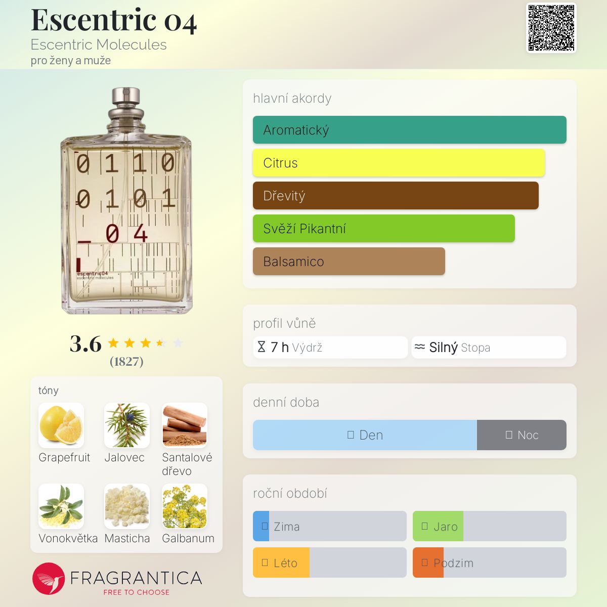 Escentric 04 podle Escentric Molecules je Woody vůně pro ženy a muže. Escentric 04 byl/a uveden/a v roce 2017. "Nosem" za touto vůní je Geza Schoen.