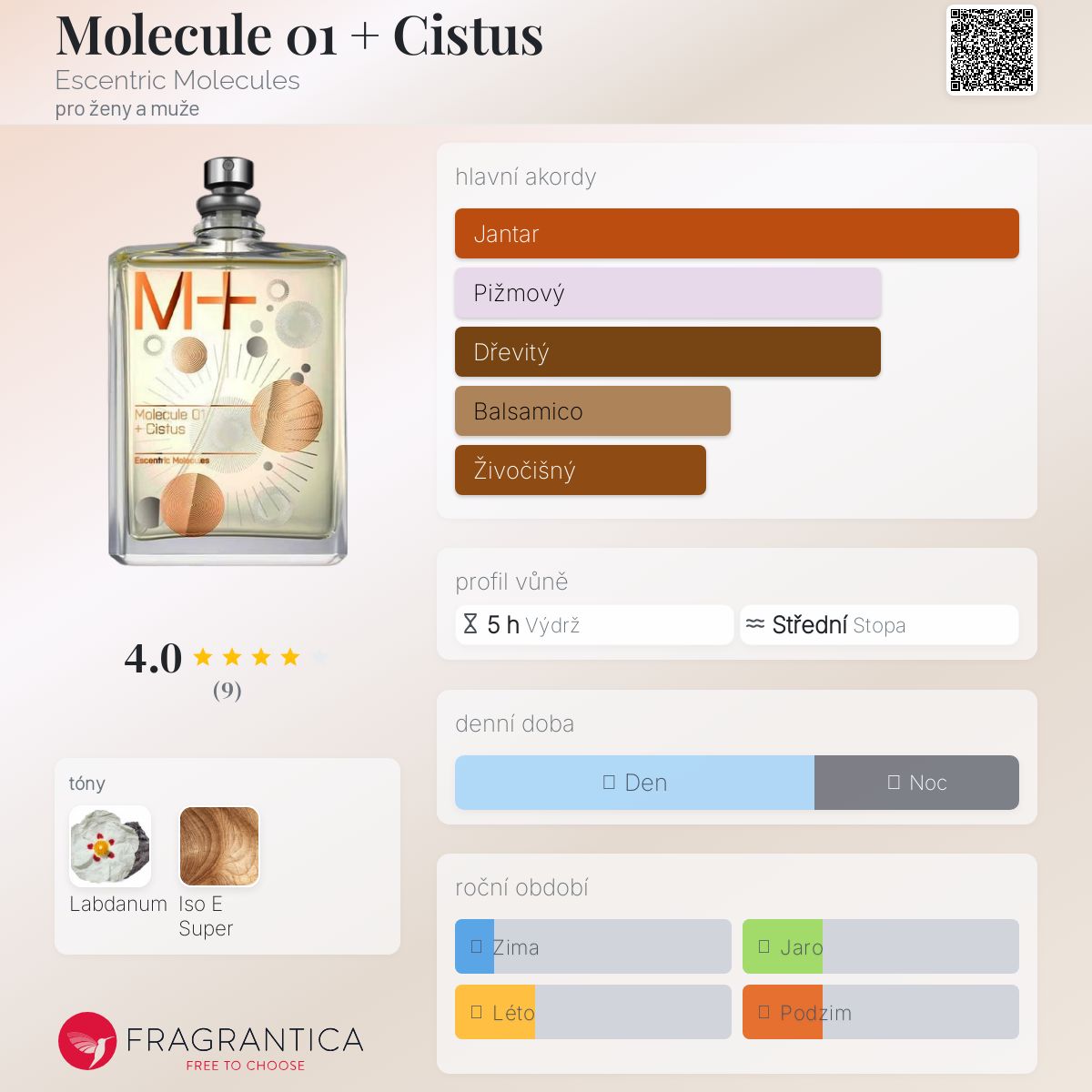 Molecule 01 + Cistus podle Escentric Molecules je Woody vůně pro ženy a muže. Toto je nová vůně. Molecule 01 + Cistus byl/a uveden/a v roce 2025. "Nosem" za touto vůní je Geza Schoen.