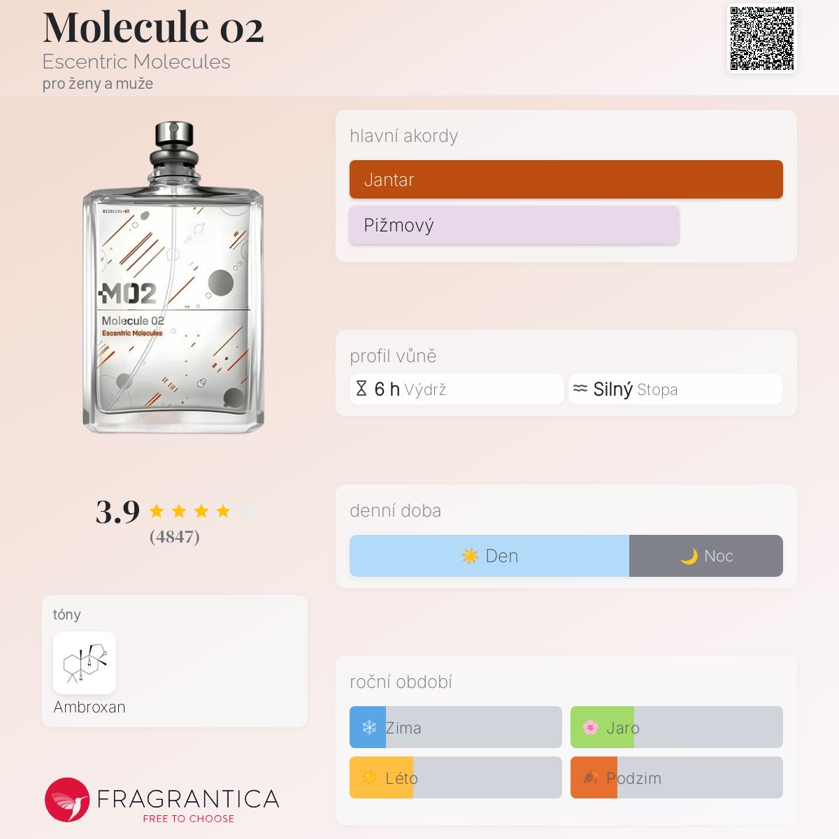 Molecule 02 od Escentric Molecules je vůně, která nezůstane bez povšimnutí... někteří se vás budou ptát, co to máte na sobě... mnozí budou vnímat její kouzlo, ale neodváží se ze stydlivosti zeptat... M-02 je další krásná syntetická vůně od Gezy Schoena... osobně ho považuji za velikána mezi velikány, neřku-li génia moderní parfumerie. Já osobně ho považuji za velikána mezi velikány, neřkuli génia moderní parfumerie, tento pán přinesl nový vzduch, nelze přehlédnout jeho odvahu vstoupit do světa vůní vsadit vše na jednu kartu a rozbít tak všechna schémata, generace mistrů parfumérů, kteří považovali za samozřejmost, že lze tvořit nové, zajímavé věci....ale vždy podle pravidel hry...no, Geza Schoen tato pravidla porušil!...úspěch jeho děl není dán velmi dobrou marketingovou strategií...je dán něčím mnohem jednodušším, je dán velmi dobrým přijetím veřejnosti obecně...věrné veřejnosti, které je každým dnem více a více.