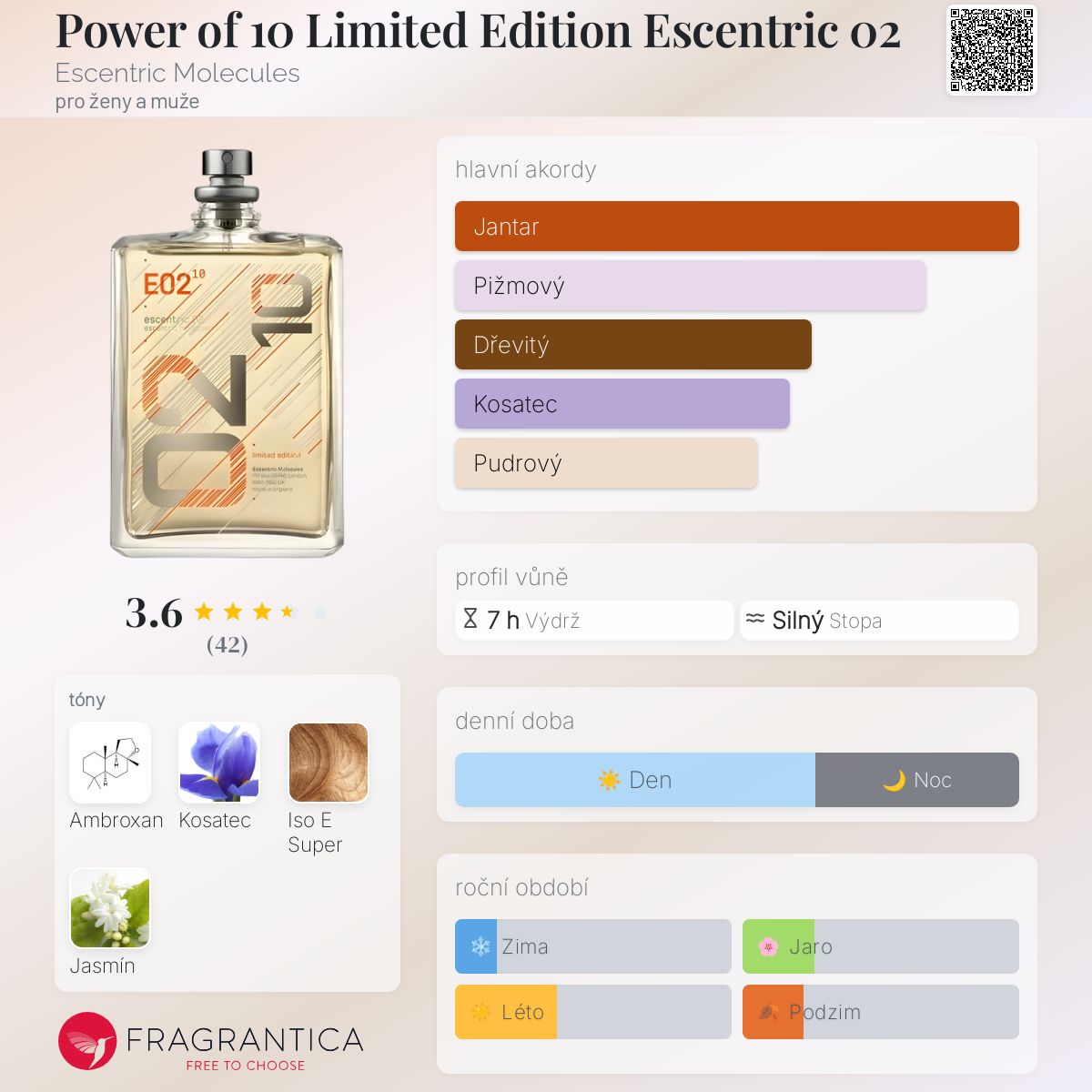 Power of 10 Limited Edition Escentric 02 podle Escentric Molecules je Orientální Floral vůně pro ženy a muže. Power of 10 Limited Edition Escentric 02 byl/a uveden/a v roce 2018. "Nosem" za touto vůní je Geza Schoen.