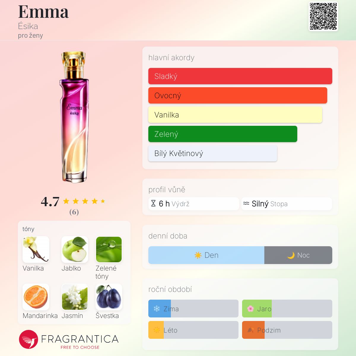 Emma podle Ésika je Orientální Floral vůně pro ženy. Emma byl/a uveden/a v roce 2013. Emma byl/a vytvořen/a Evelyne Boulanger a Clito Hoedicke. Vrchní tóny jsou Jablko, Zelený tón a Mandarinka; střední tóny jsouJasmín, Sušené švestky a Červená růže ; základní tóny jsou Vanilkový květ, Santalové dřevo, Pralinka a Jantar (ambra).