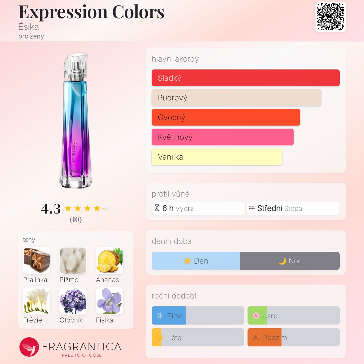 Expression Colors podle Ésika je Floral Fruity vůně pro ženy. Vrchní tóny jsou Ananas, Jablko, Citrón a Švestka; střední tóny jsouFrézie, Otočník, Fialka a Mandle ; základní tóny jsou Pralinka, Pižmo, Vanilka a Santalové dřevo.