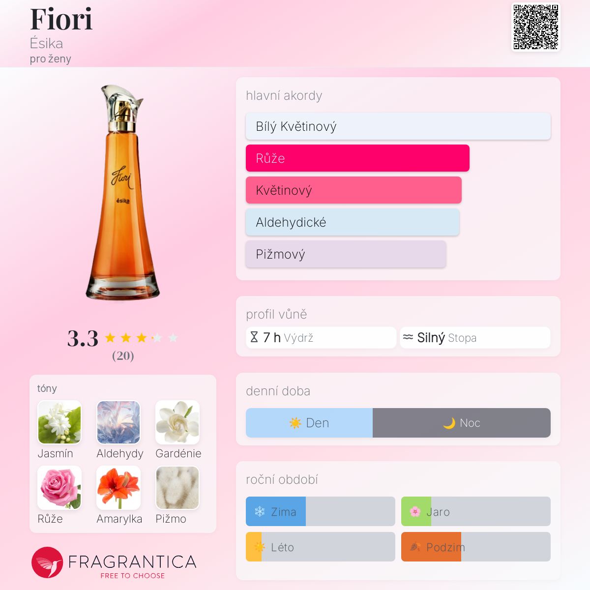 Fiori podle Ésika je Chypre Fruity vůně pro ženy. Fiori byl/a uveden/a v roce 2004. Vrchní tóny jsou Aldehydy, Gardénie a Bergamot; střední tóny jsouJasmín, Růže, Amarylka a Narcis ; základní tóny jsou Pižmo, Vetiver a Jantar (ambra).