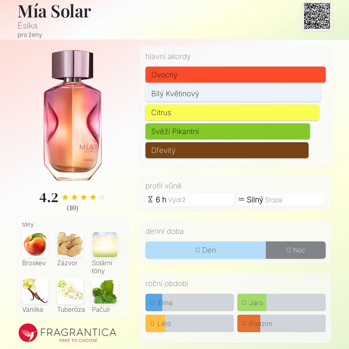 Mía Solar podle Ésika je Floral vůně pro ženy. Vrchní tóny jsou Bílá broskev, Zázvor, Bergamot, Mandarinka a Hruška; střední tóny jsouSolární tóny, Tuberóza, Jasmín, Magnólie a Gardénie ; základní tóny jsou Vanilka, Pačuli, Santalové dřevo, Cedr a Jantar (ambra).