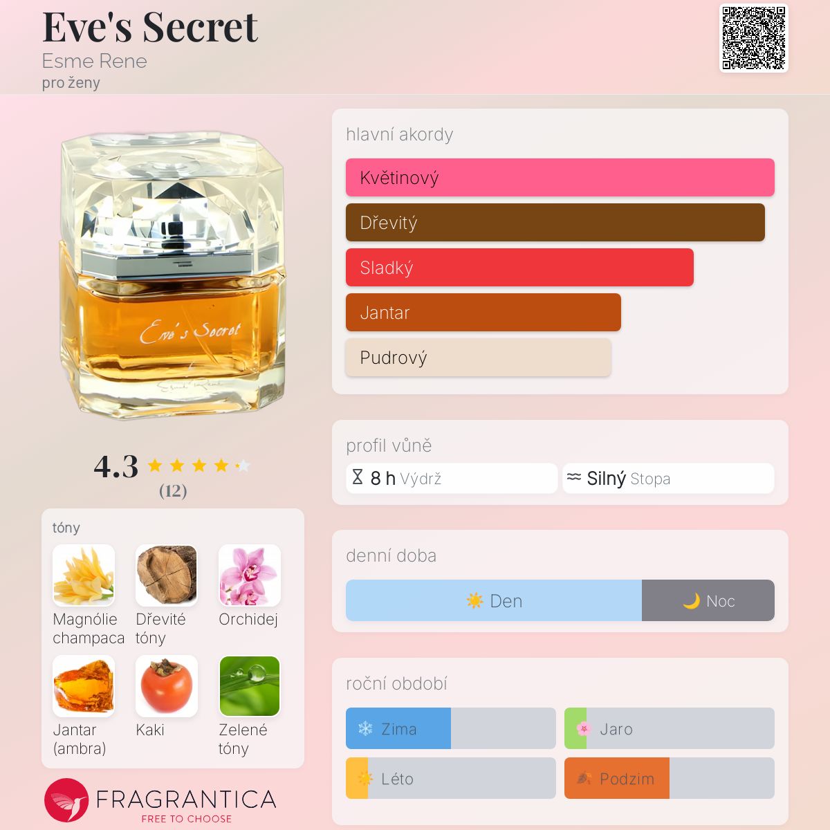 Eve's Secret podle Esme Rene je Floral Fruity vůně pro ženy. Eve's Secret byl/a uveden/a v roce 2009. Vrchní tóny jsou Kaki, Zelené tóny a Granátové jablko; střední tóny jsouMagnólie champaca, Orchidej, Lotus a Fialka ; základní tóny jsou Dřevité tóny, Jantar (ambra), Pižmo a Mahagon.
