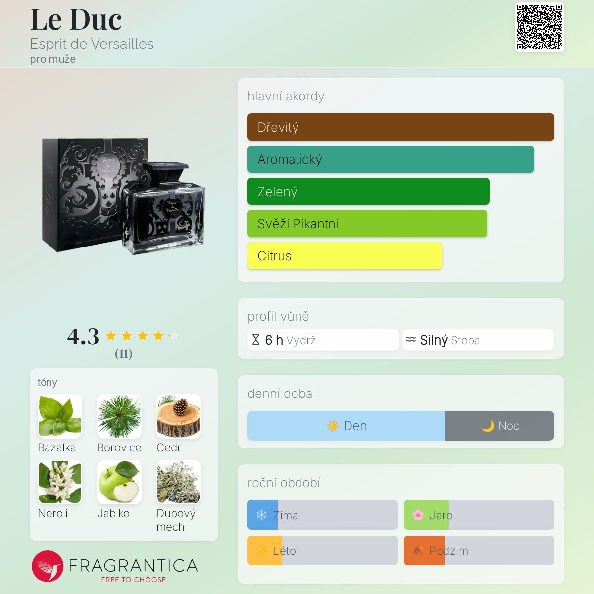Le Duc podle Esprit de Versailles je Woody Aromatic vůně pro muže. "Nosem" za touto vůní je Vincent Schaller. Vrchní tóny jsou Bazalka, Zelené jablko a Citrón; střední tóny jsouBorovice, Neroli a Labdanum ; základní tóny jsou Cedr, Dubový mech a Pačuli.