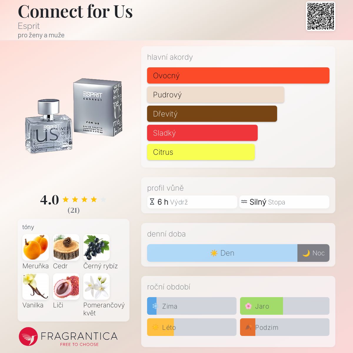 Connect for Us podle Esprit je Floral Fruity vůně pro ženy a muže. Connect for Us byl/a uveden/a v roce 2007. "Nosem" za touto vůní je Jean-Christophe Hérault. Vrchní tóny jsou Černý rybíz, Liči, Mandarinka a Jablko; střední tóny jsouPomerančový květ, Fialka a Hyacint ; základní tóny jsou Meruňka, Cedr, Vanilka, Pižmo, Jantar (ambra) a Broskev.