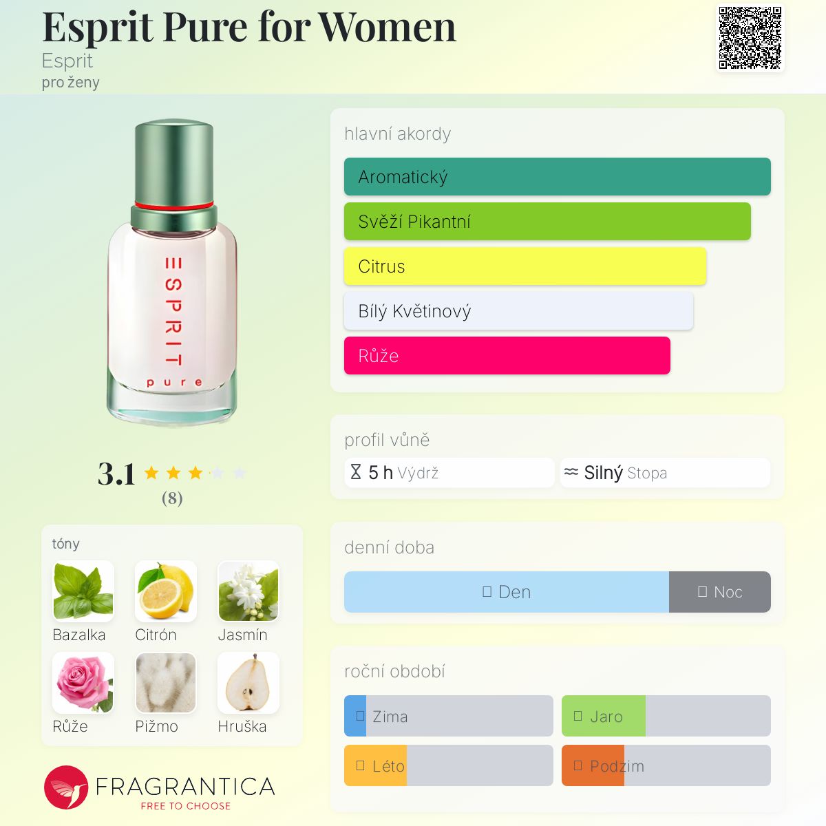 Esprit Pure for Women podle Esprit je Floral Woody Musk vůně pro ženy. Esprit Pure for Women byl/a uveden/a v roce 2015. "Nosem" za touto vůní je Alienor Massenet. Vrchní tóny jsou Bazalka, Citrón a Hruška; střední tóny jsouJasmín, Damašská růže a Otočník ; základní tóny jsou Pižmo, Cypřiš a Benzoin.