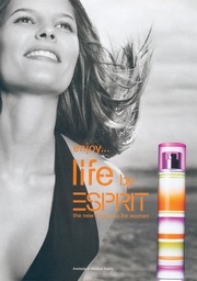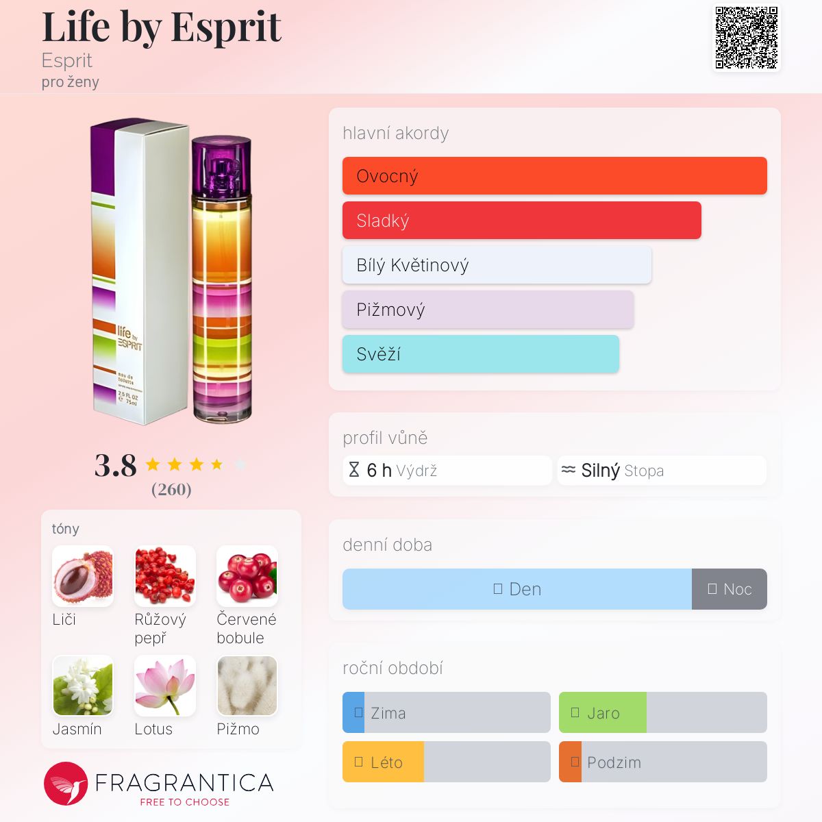 Life by Esprit podle Esprit je Floral Woody Musk vůně pro ženy. Life by Esprit byl/a uveden/a v roce 2003. "Nosem" za touto vůní je Evelyne Boulanger. Vrchní tóny jsou Liči, Růžový pepř, Cukrová vata, Hruška a Švestka; střední tóny jsouČervené bobule, Jasmín, Lotus, Gardénie a Orchidej ; základní tóny jsou Pižmo, Kašmírové dřevo, Santalové dřevo a Bílý jantar (ambra).