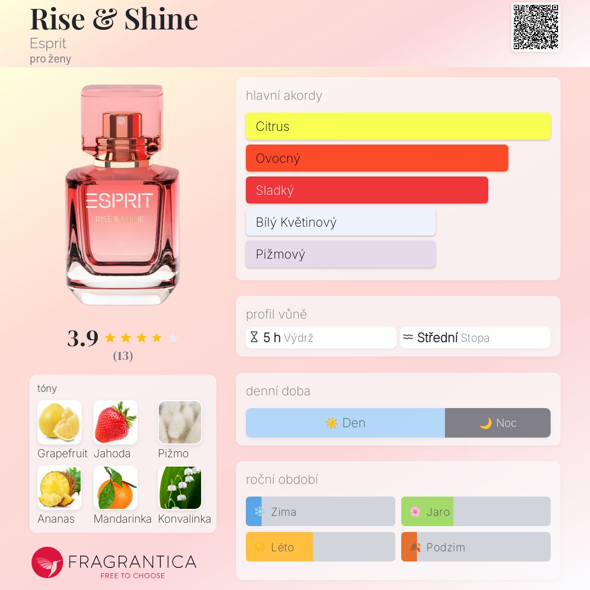 Rise & Shine podle Esprit je vůně pro ženy. Rise & Shine byl/a uveden/a v roce 2022. Vrchní tóny jsou Grapefruit, Jahoda, Ananas a Mandarinka; střední tóny jsouKonvalinka, Vanilková orchidej, Jasmín a Pivoňka ; základní tóny jsou Pižmo a Dřevité tóny.