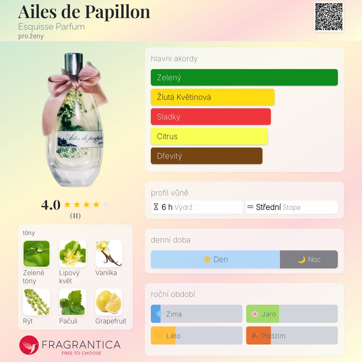 Ailes de Papillon podle Esquisse Parfum je Orientální Floral vůně pro ženy. Ailes de Papillon byl/a uveden/a v roce 2017. "Nosem" za touto vůní je Marina Volkova. Vrchní tóny jsou Zelené tóny, Bílý grapefruit, Bergamot a Jasmín; střední tóny jsouLipový květ, Vanilka, Rýt, Pačuli a Kašmír ; základní tóny jsou Galbanum, Dřevité tóny, Jantar (ambra) a Pižmo.