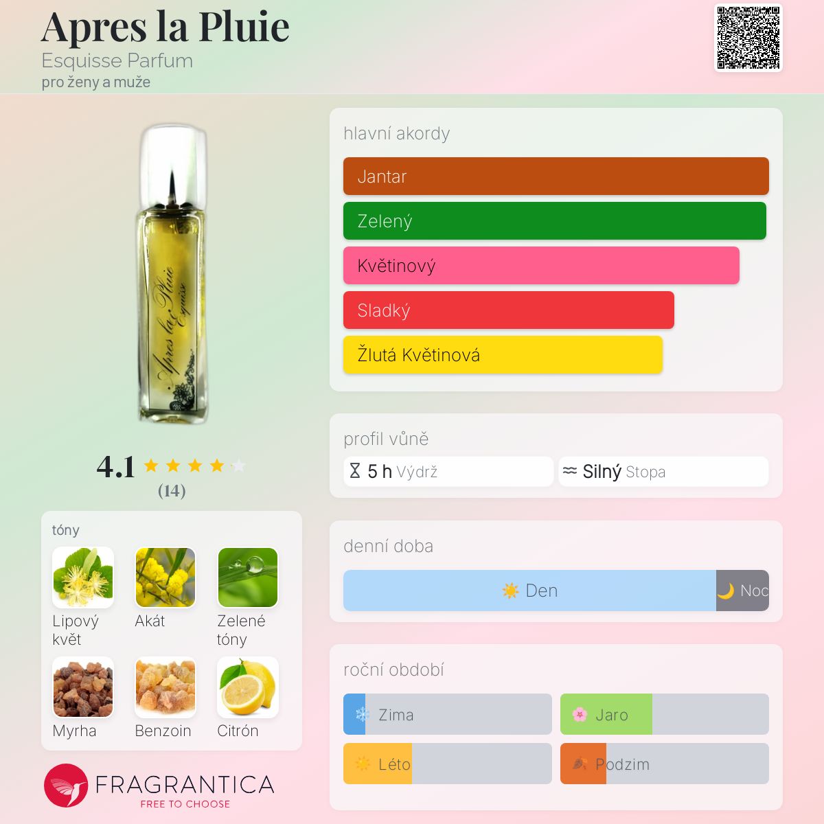 Apres la Pluie podle Esquisse Parfum je vůně pro ženy a muže. "Nosem" za touto vůní je Marina Volkova. Vrchní tóny jsou Zelený tón, Citrón, Bergamot a Jasmín; střední tóny jsouLipový květ, Akát, Koriandr, Zelený čaj, Meloun, Andělika a Okurka ; základní tóny jsou Myrha, Benzoin, Pižmo a Santalové dřevo.