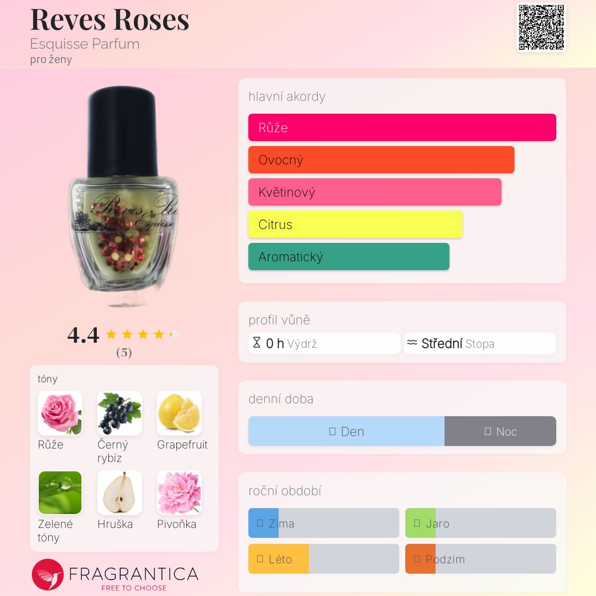 Reves Roses podle Esquisse Parfum je Floral Fruity vůně pro ženy. Reves Roses byl/a uveden/a v roce 2018. "Nosem" za touto vůní je Marina Volkova. Vrchní tóny jsou Růžový grapefruit, Zelený tón a Hruška; střední tóny jsouRůže de Mai, Černý rybíz, Pivoňka, Kosatec, Ylang-Ylang, Semiš a Růžový pepř ; základní tóny jsou Elimi, Jantar (ambra), Pižmo a Palisandr.