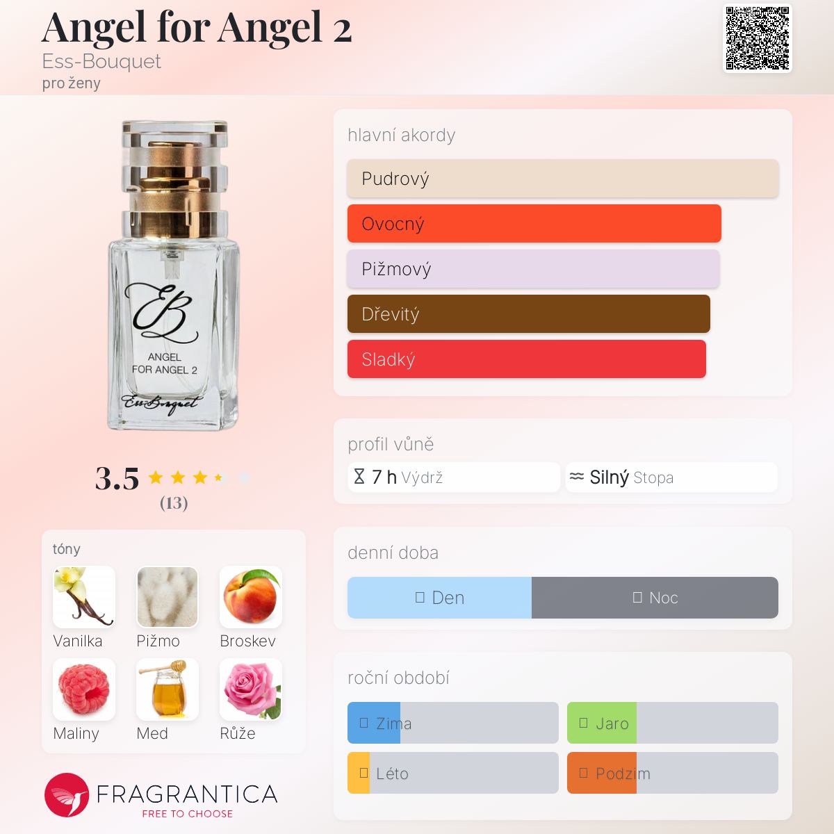 Angel for Angel 2 podle Ess-Bouquet je Floral Fruity vůně pro ženy. Toto je nová vůně. Angel for Angel 2 byl/a uveden/a v roce 2024. "Nosem" za touto vůní je Julia Karpova. Vrchní tóny jsou Bílá broskev, Maliny, Černý rybíz a Bergamot; střední tóny jsouMed, Růže, Kosatec, Magnólie a Jasmín ; základní tóny jsou Vanilka, Bílé pižmo, Pačuli, Kašmír a Dubový mech.