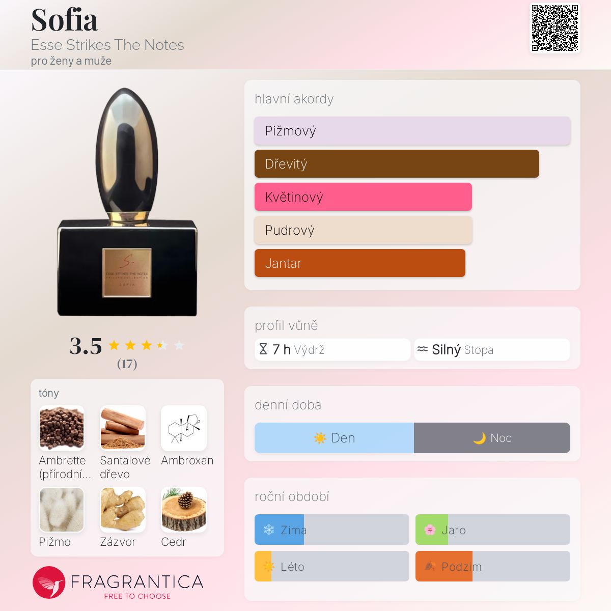 Sofia podle Esse Strikes The Notes je vůně pro ženy a muže. Sofia byl/a uveden/a v roce 2023. Sofia byl/a vytvořen/a Paolo Cerizza a Martino Cerizza. Vrchní tóny jsou Zázvor, Cedr a Neroli; střední tóny jsouAmbrette (přírodní pižmo), Plumérie a Ylang-Ylang ; základní tóny jsou Santalové dřevo, Ambroxan, Bílé pižmo, Fazole tonka a Dubový mech.