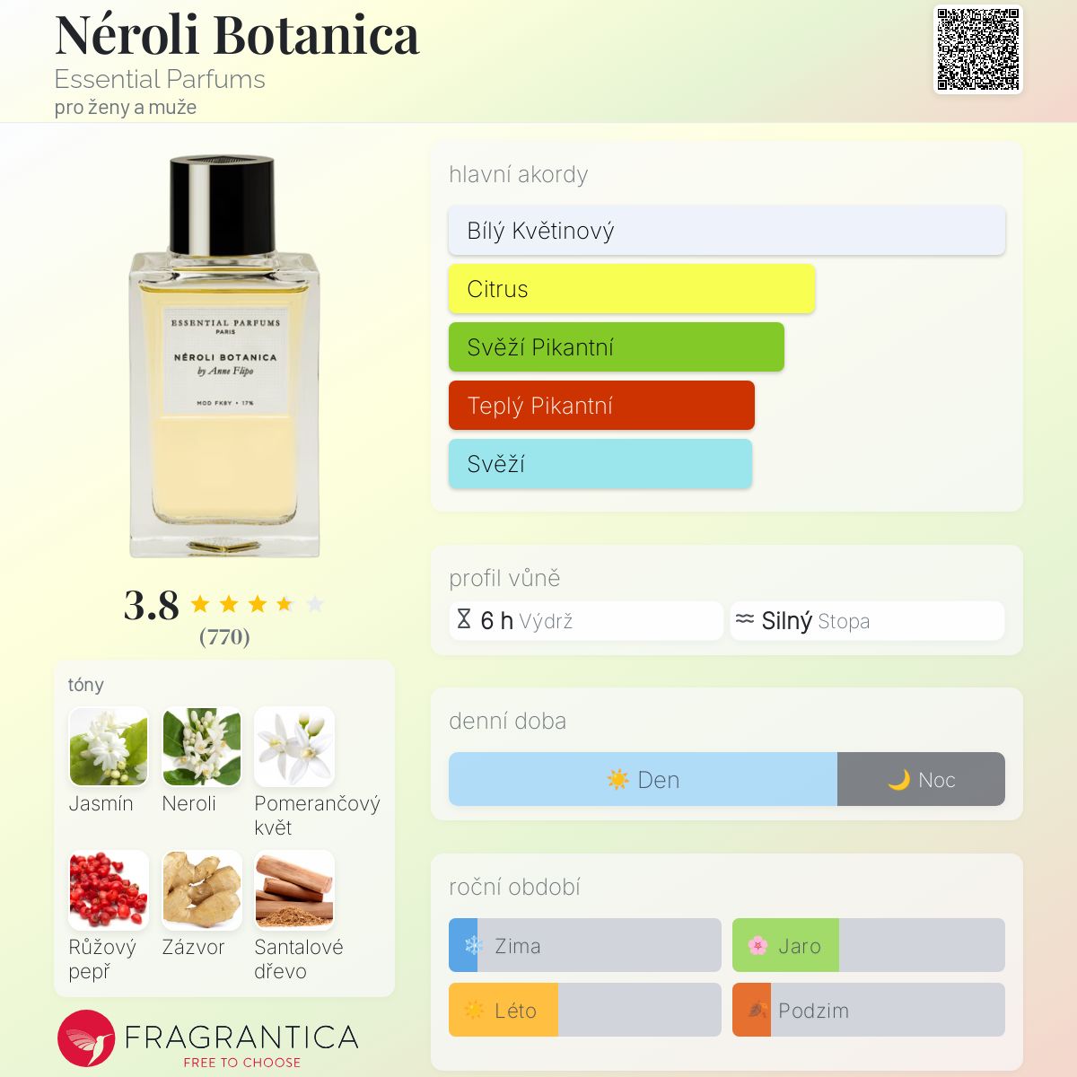Néroli Botanica podle Essential Parfums je Citrus vůně pro ženy a muže. Toto je nová vůně. Néroli Botanica byl/a uveden/a v roce 2024. "Nosem" za touto vůní je Anne Flipo. Vrchní tóny jsou Růžový pepř, Zázvor, Černý pepř a Kurkuma; střední tóny jsouNeroli, Jasmín a Pomerančový květ ; základní tóny jsou Santalové dřevo, Vetiver a Benzoin.