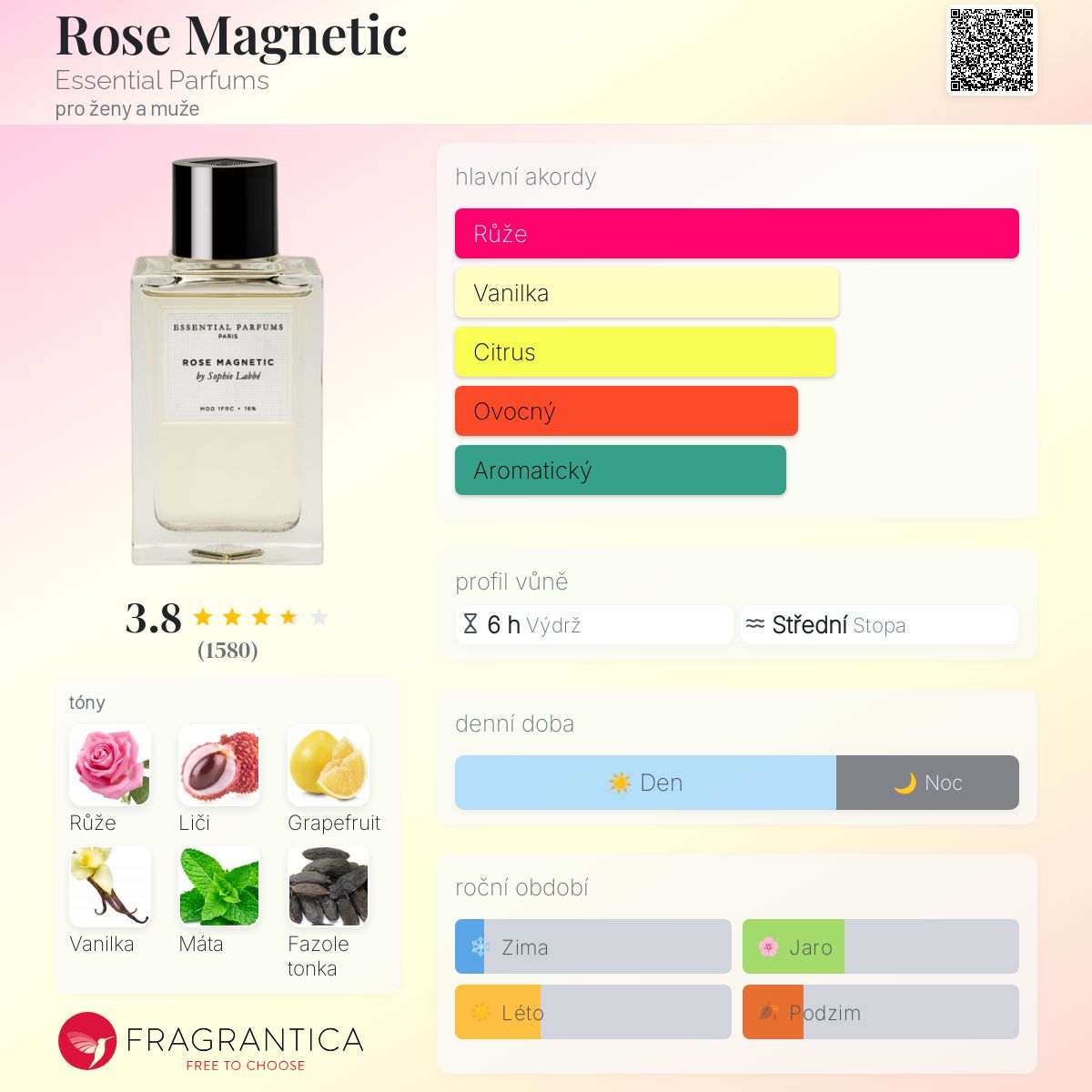 Tóny liči, tonky a vanilky posouvají tuto růžovou vůni pudinkovým směrem. Úvod je lahodný a krásný, velmi jemný a ženský. Rose magnetic je krémovější než Stella a méně ostrá, ale komplexnější než Izia, obě zde na Fragrantice hlasovaly podobně.