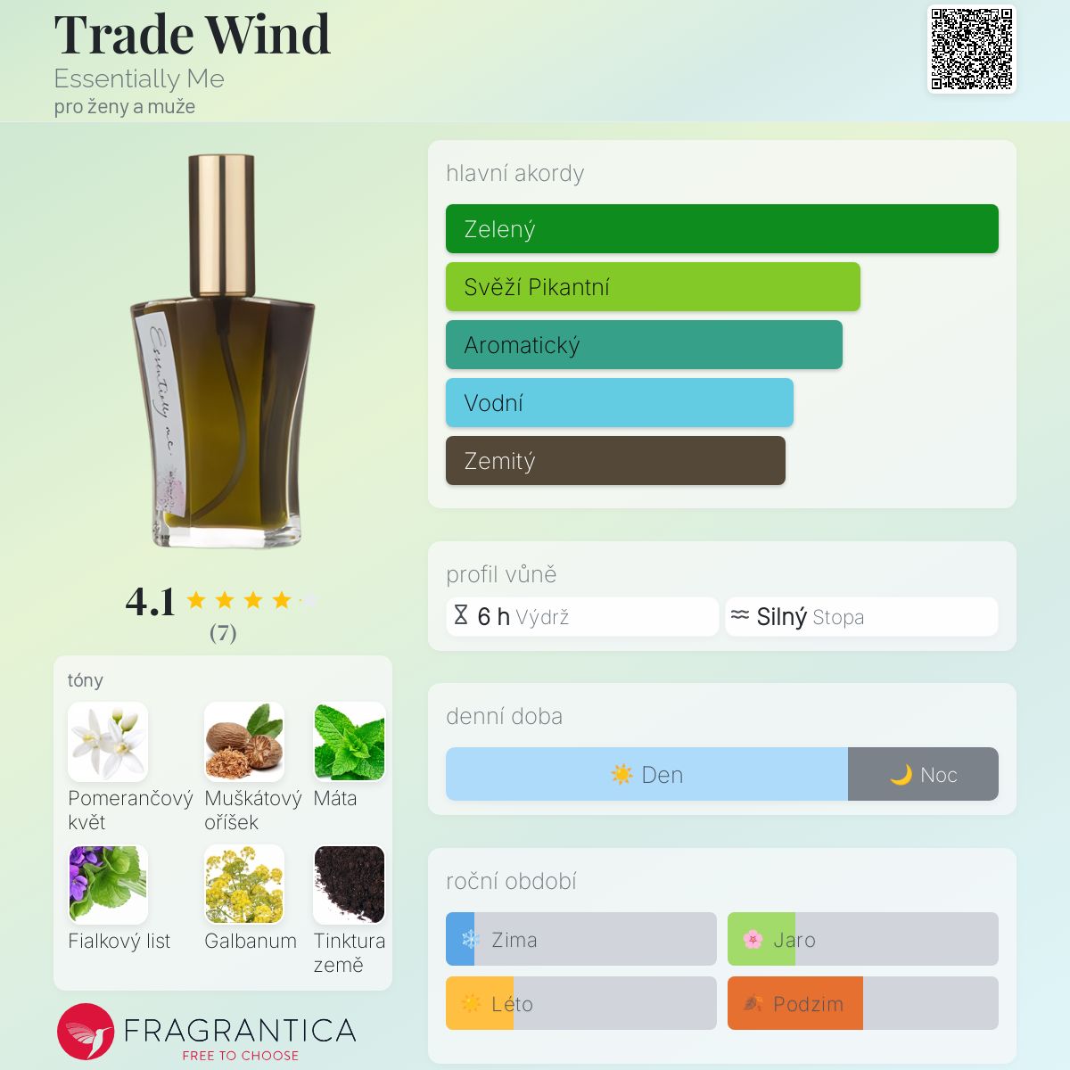 Trade Wind podle Essentially Me je vůně pro ženy a muže. Vrchní tóny jsou Květ afrického pomeranče, Muškátový oříšek, Lipový květ a Seno; střední tóny jsouMáta, Fialkový list a Mořská řasa ; základní tóny jsou Galbanum, Půdní tinktura, Vetiver a Santalové dřevo.