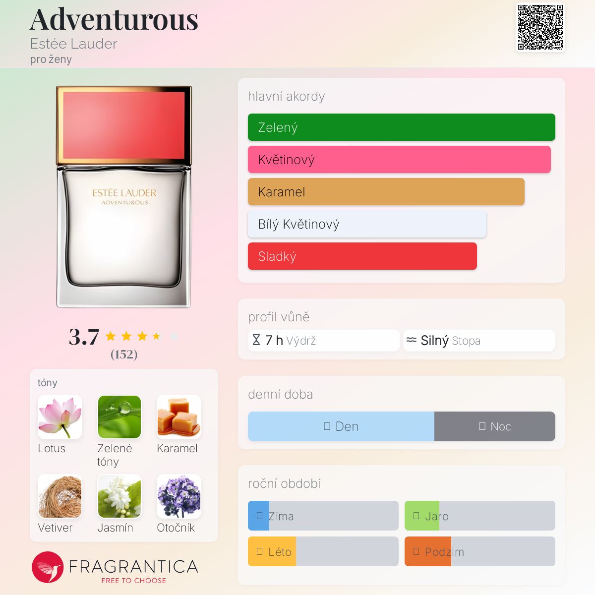 Adventurous podle Estée Lauder je Floral Fruity Gourmand vůně pro ženy. Adventurous byl/a uveden/a v roce 2011. Vrchní tóny jsou Zelené tóny, Červené bobule a Mandarinka; střední tóny jsouLotus, Jasmín a Otočník ; základní tóny jsou Karamel, Vetiver a Pižmo.