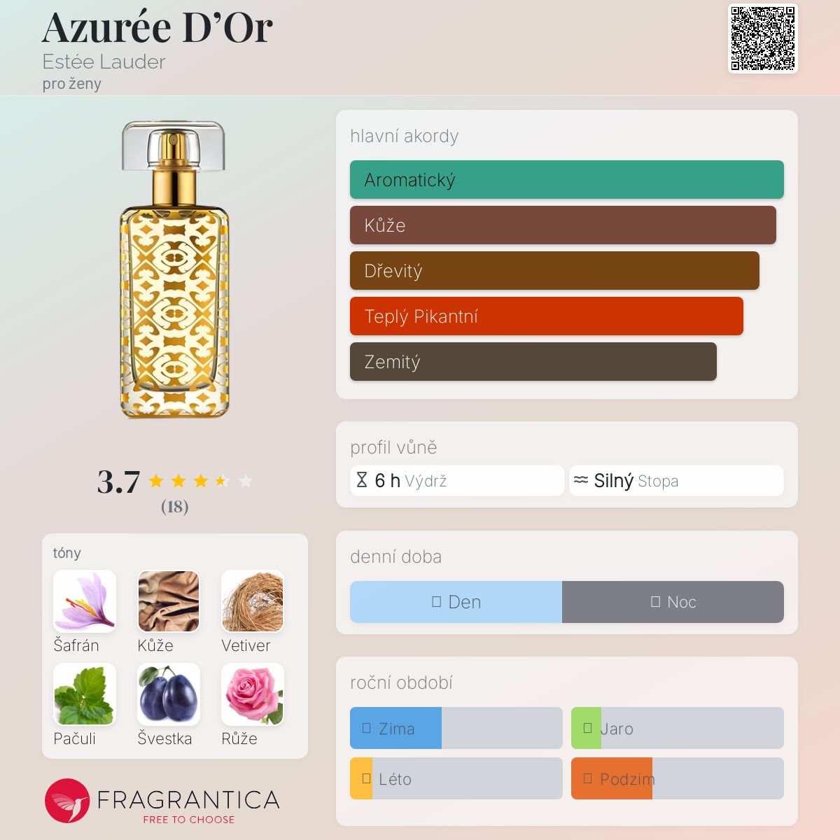 Azurée D’Or podle Estée Lauder je Orientální Floral vůně pro ženy. Azurée D’Or byl/a uveden/a v roce 2017. Vrchní tóny jsou Šafrán, Švestka, Růžový pepř a Šalvěj muškátová; střední tóny jsouRůže, Galbanum a Jasmín ; základní tóny jsou Kůže, Vetiver, Pačuli, Labdanum a Kořen orris.