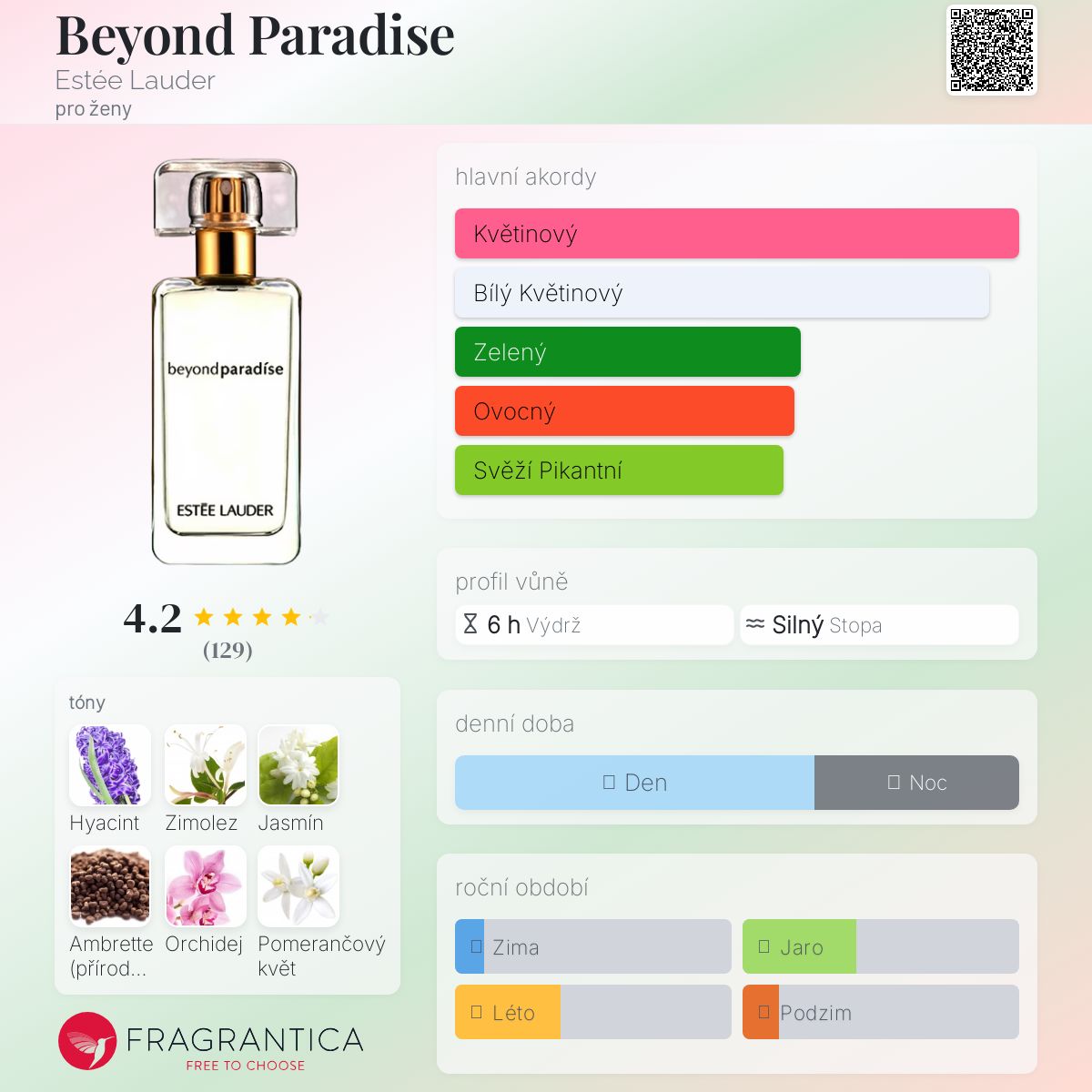 Beyond Paradise podle Estée Lauder je vůně pro ženy. Beyond Paradise byl/a uveden/a v roce 2015. Vrchní tóny jsou Modrý hyacint, Pomerančový květ a Jaboticaba; střední tóny jsouZimolez, Jasmín, Orchidej a Mahónie ; základní tóny jsou Ambrette (přírodní pižmo), Švestkové květy, Dřevité tóny a Papírová kůra.